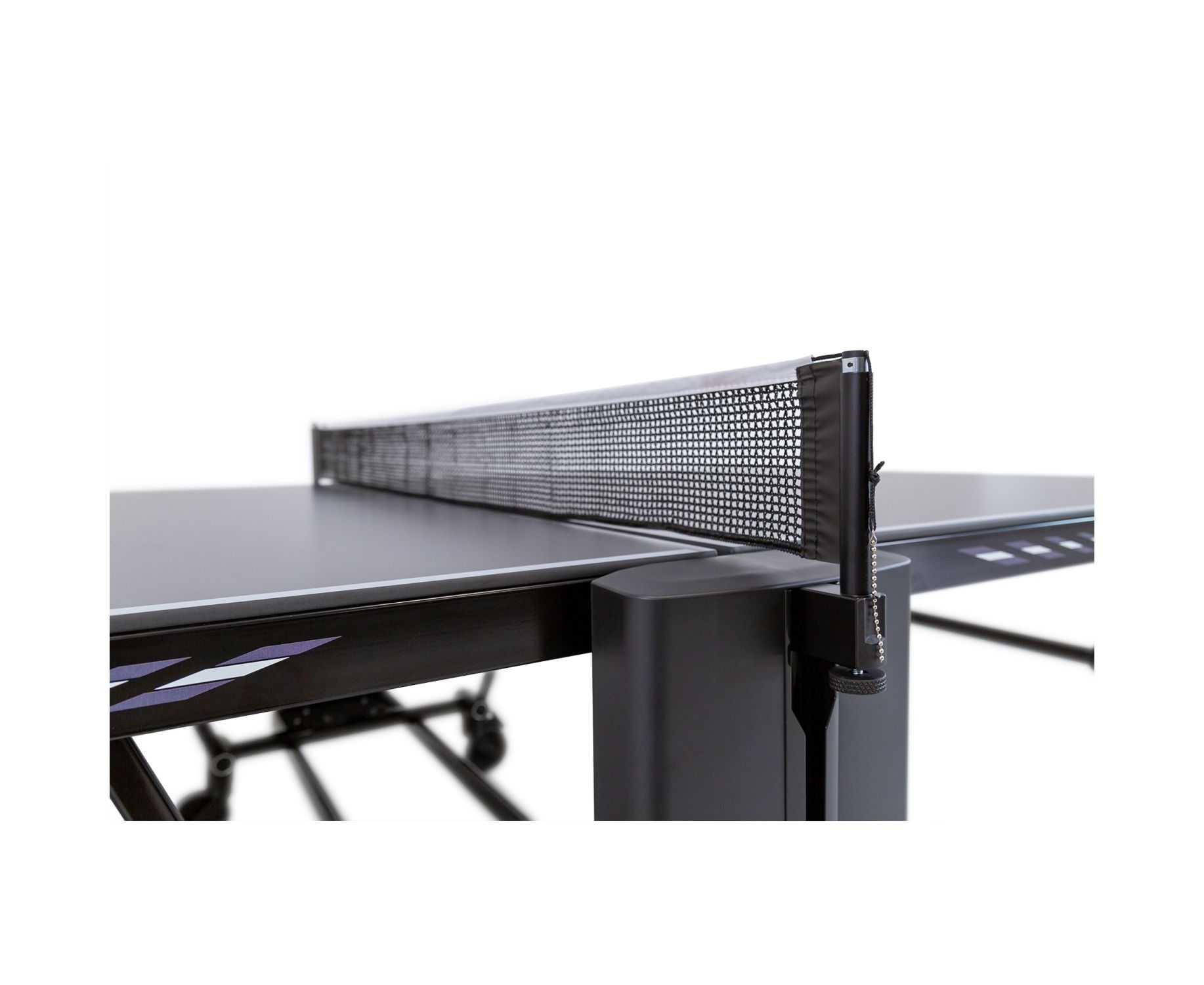 Его плита изготовлена из меламина антрацитового цвета толщиной 10 мм. Профиль рамы составляет 60х20 мм, обеспечивая стабильность и прочность. Сетка для настольного тенниса может регулироваться по высоте и степени натяжения, что позволяет подстраивать ее под каждого игрока.