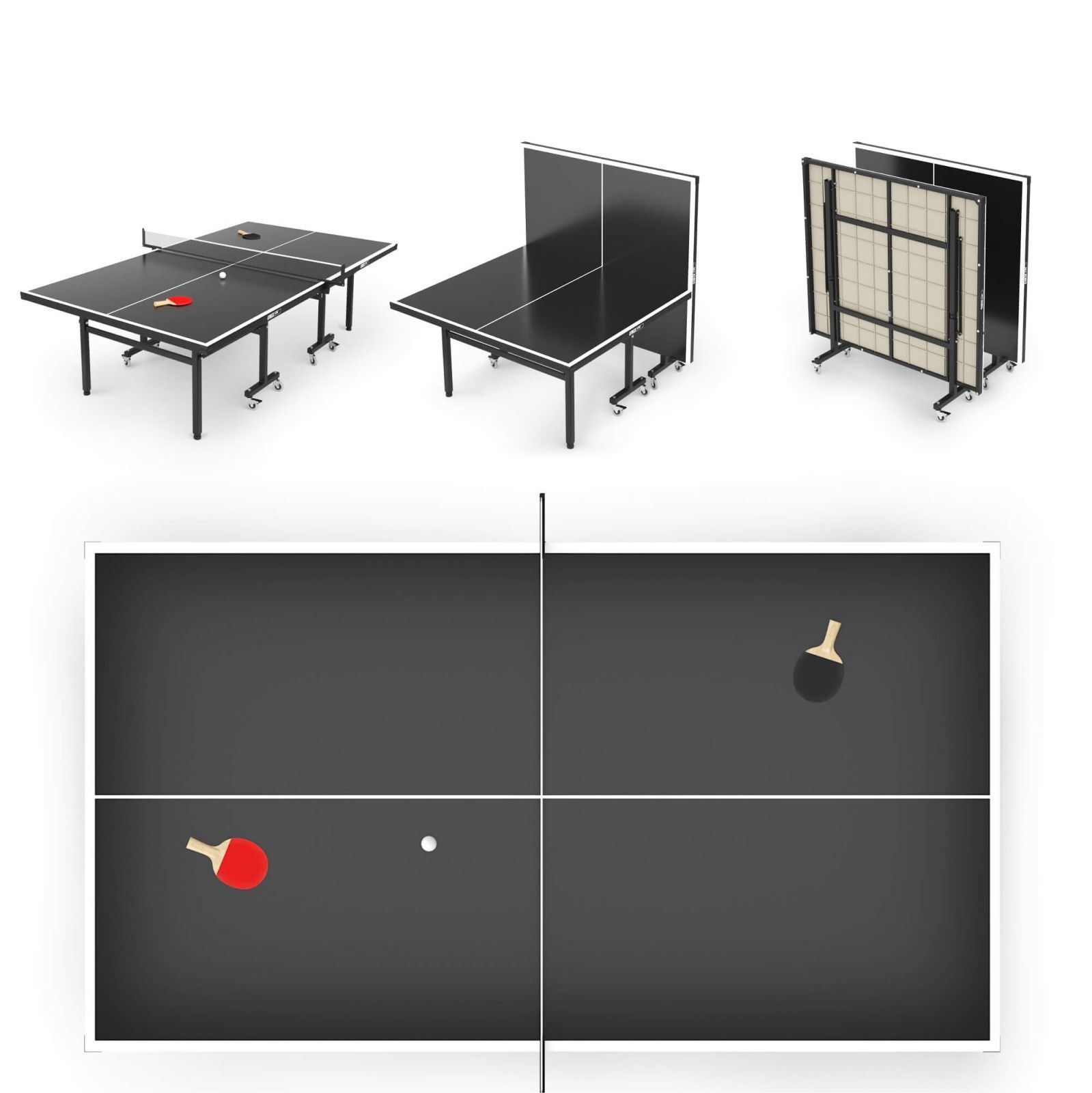 Для комфортного перемещения теннисный стол имеет 8 прорезиненных колес Ø75 мм с подшипниками. Все колеса маневровые и обладают высокой износостойкостью, 4 из них оборудованы фиксаторами.