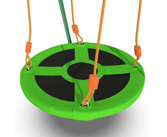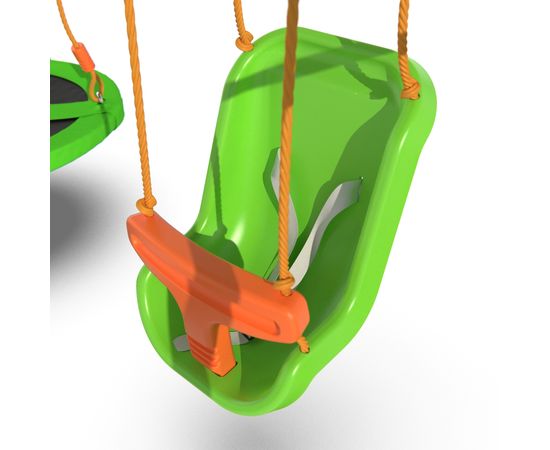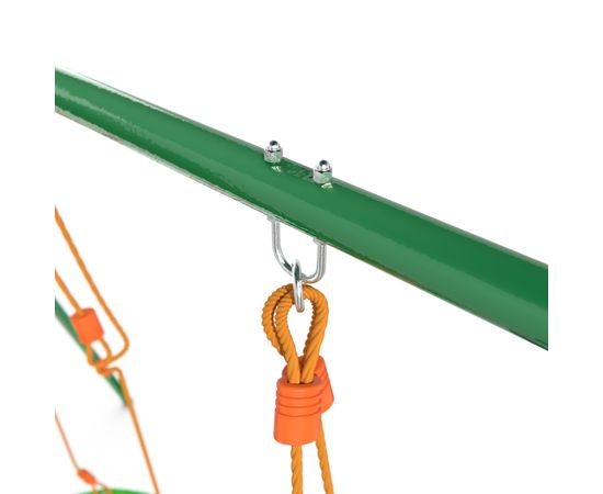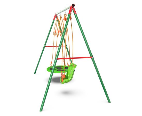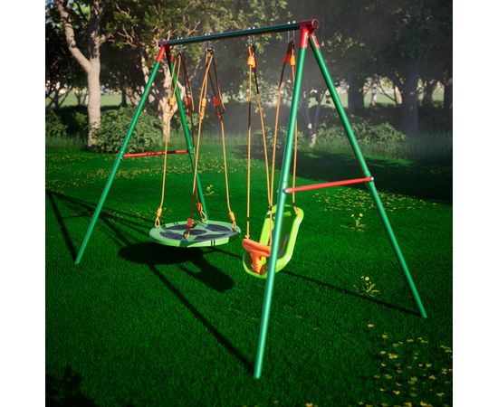 В конструкции качелей используются только качественные, прочные и безопасные материалы, гарантирующие длительный срок службы, — стальной профиль 45×1,5 и 50,8×2 мм в качестве опор устойчив к изгибающим деформациям и выдерживает нагрузку до 70 кг (по 35 кг на каждый снаряд). Веревочные качели подойдут для малышей от 18 месяцев, а на качели-гнездо для катания допускаются детки от 3 лет.