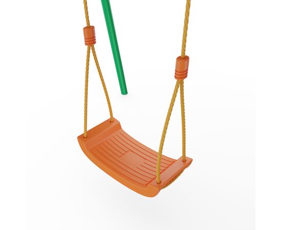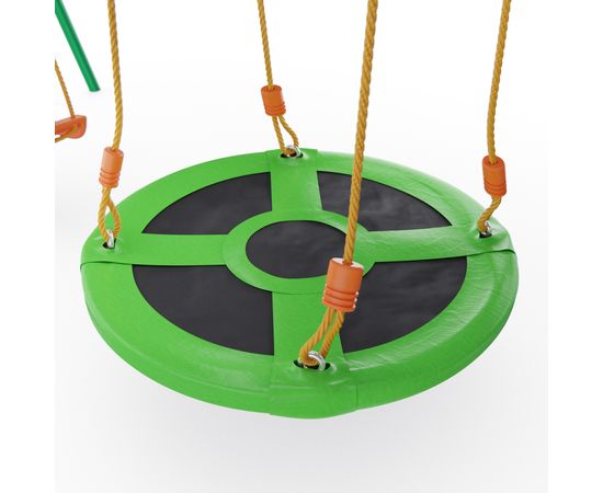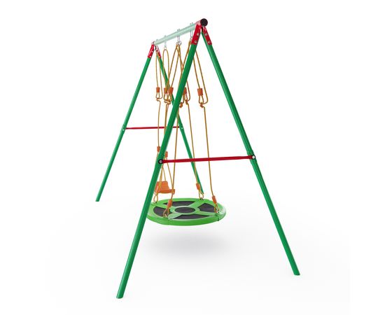 Габариты комплекса составляют 274×156×196 см и обеспечивают достаточное количество свободного пространства для исключения травматизации детей, при этом разместить его можно и дома, поскольку он довольно компактен. В состав комплекса входят веревочные качели, которые мы так любили в детстве, и качели-гнездо — уже более современный вариант.