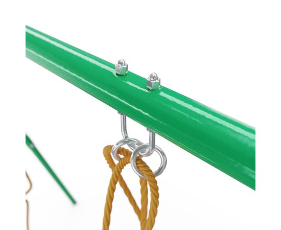 Опорные элементы качелей выполнены в виде каркаса из стального профиля 25, 4×1,0 мм, 45×1,5 мм и 50,8×2 мм повышенной прочности — характеристики стали соответствуют государственным стандартам и требованиям безопасности; каркас усилен дополнительными элементами для увеличения жесткости и надежности. Играть на комплексе разрешается детям от 3 лет. Максимальная нагрузка 70 кг.