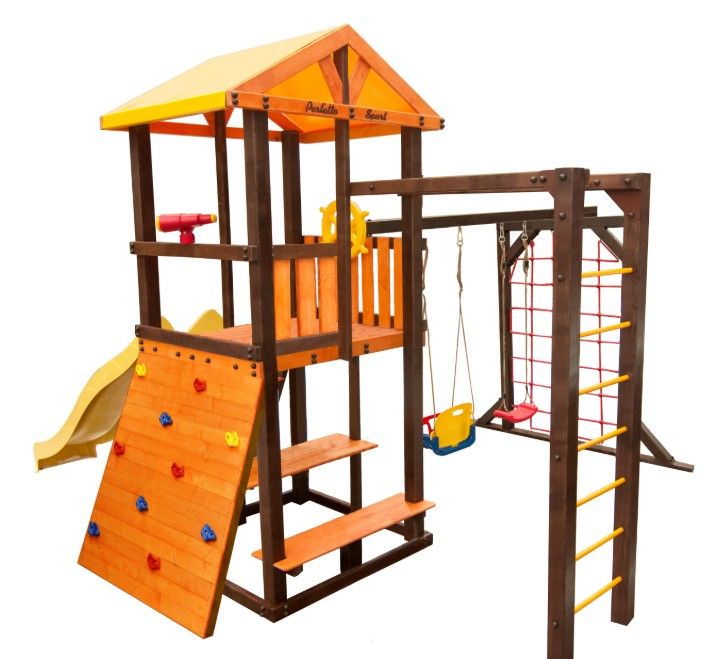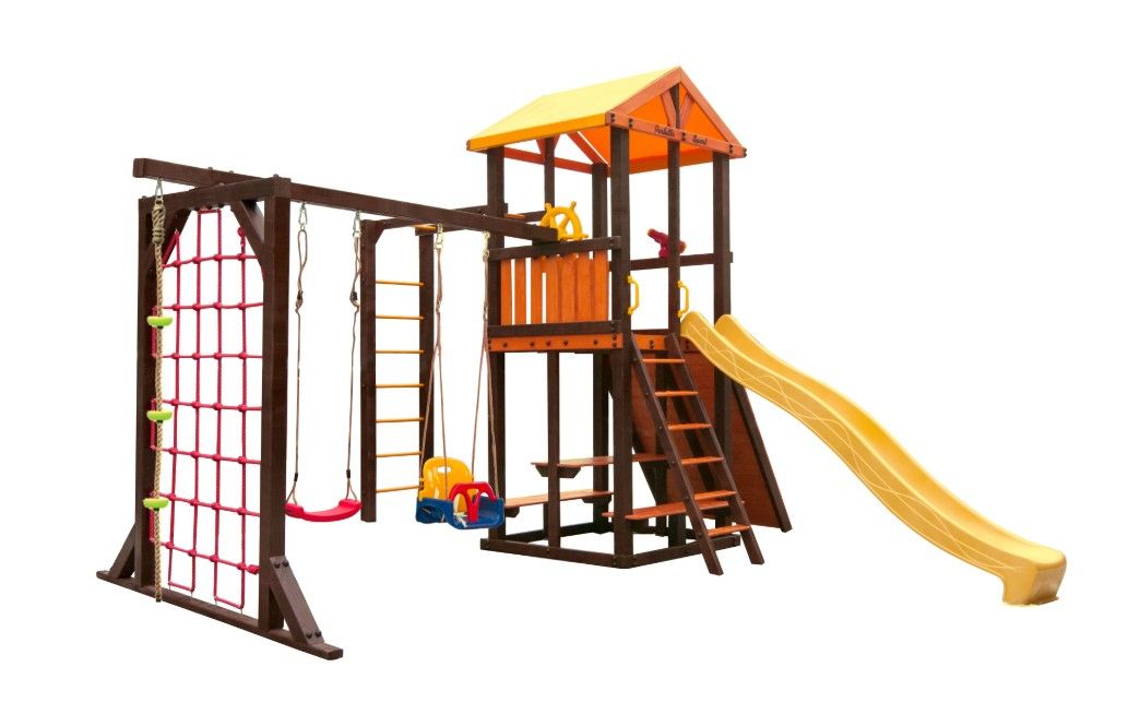 Комплектация: игровой домик, столик, лавочка - 2 шт, лестница, скат, ручка пластиковая - 2 шт, Р-опция, П-опция, качели "Лодочка", качели "Малыш", канат с зацепами, штурвал "Шторм", бинокль "Капитан", скалодром большой