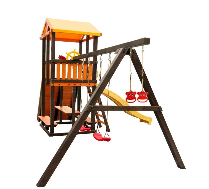 Комплектация: игровой домик, столик, лавочка - 2 шт, лестница, скат, ручка пластиковая - 2 шт, А-опция, качели "Лодочка" 2 шт, кольца "Микки", штурвал "Шторм", бинокль "Капитан", скалодром большой