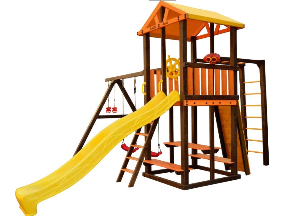 Комплектация: игровой домик, столик, лавочка - 2 шт, лестница, скат, ручка пластиковая - 2 шт, Р-опция, А-опция, качели "Лодочка" 2 шт, кольца "Микки", штурвал "Шторм", бинокль "Капитан", скалодром маленький