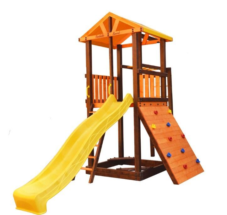 Комплектация: игровой домик, песочница, лестница, скат, ручка пластиковая - 2 шт, Р-опция, скалодром большой