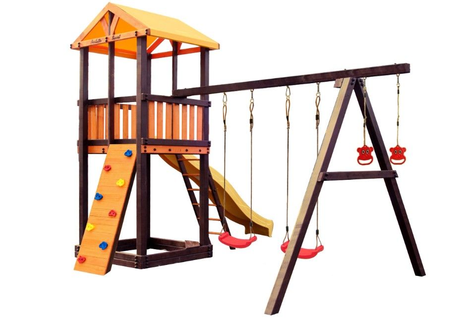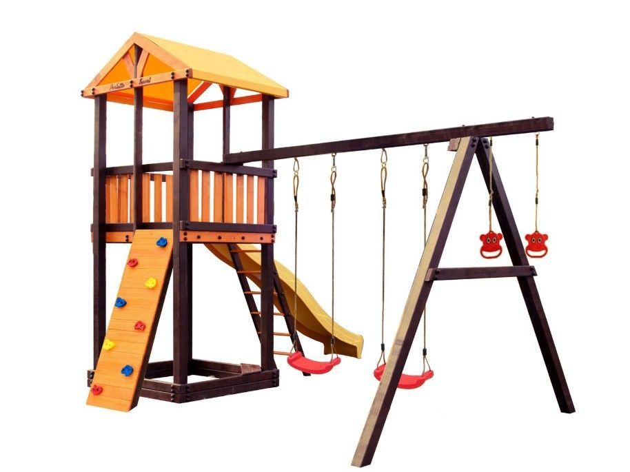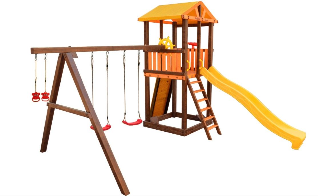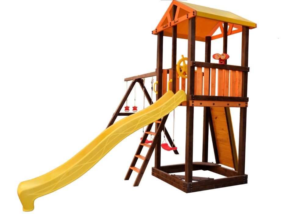 Комплектация: игровой домик, песочница, лестница, скат, ручка пластиковая - 2 шт, А-опция, качели "Лодочка" 2 шт, кольца "Микки", штурвал "Шторм", бинокль "Капитан", скалодром маленький