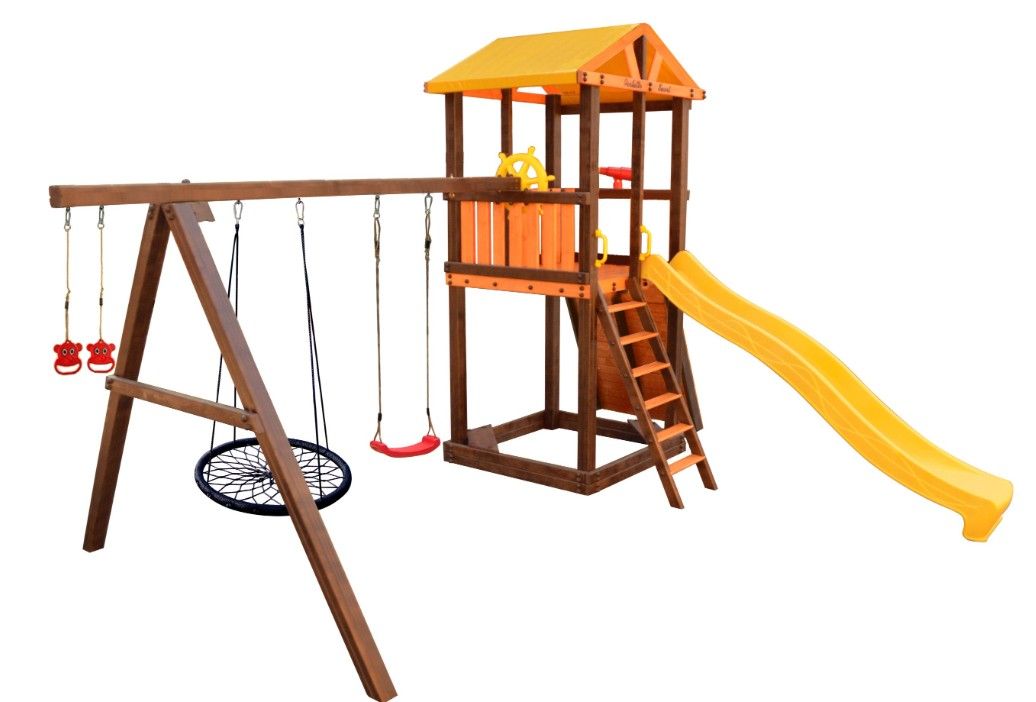Комплектация: игровой домик, песочница, лестница, скат, ручка пластиковая - 2 шт, А-опция, качели "Лодочка" 2 шт, кольца "Микки", штурвал "Шторм", бинокль "Капитан", качели "Паутина" скалодром большой