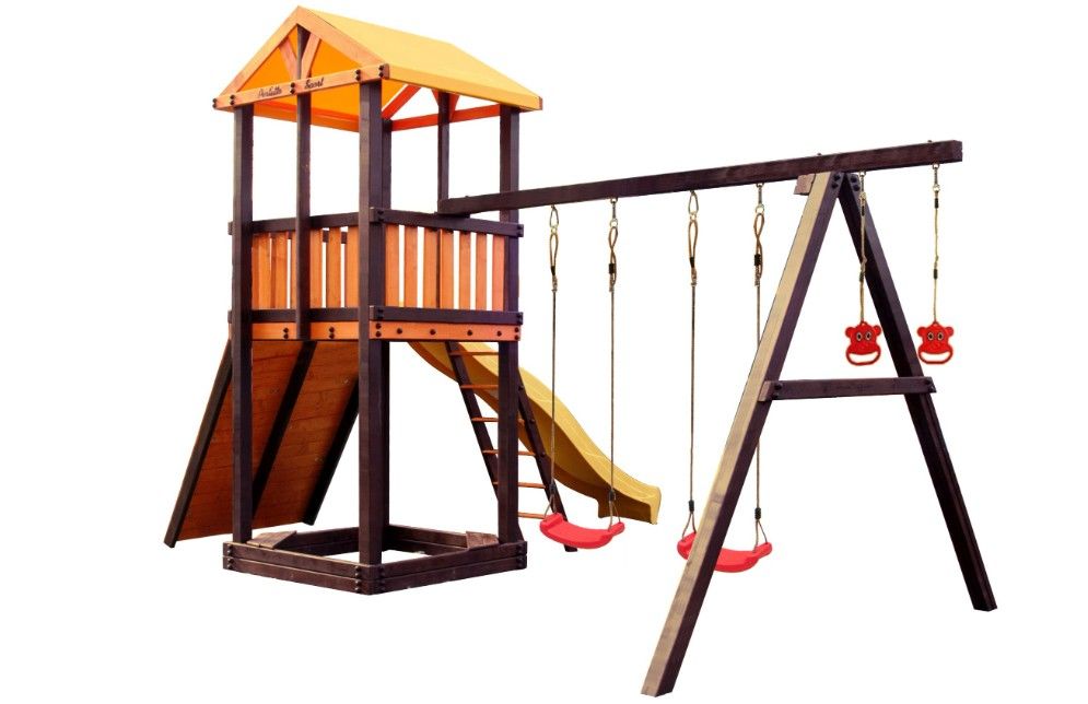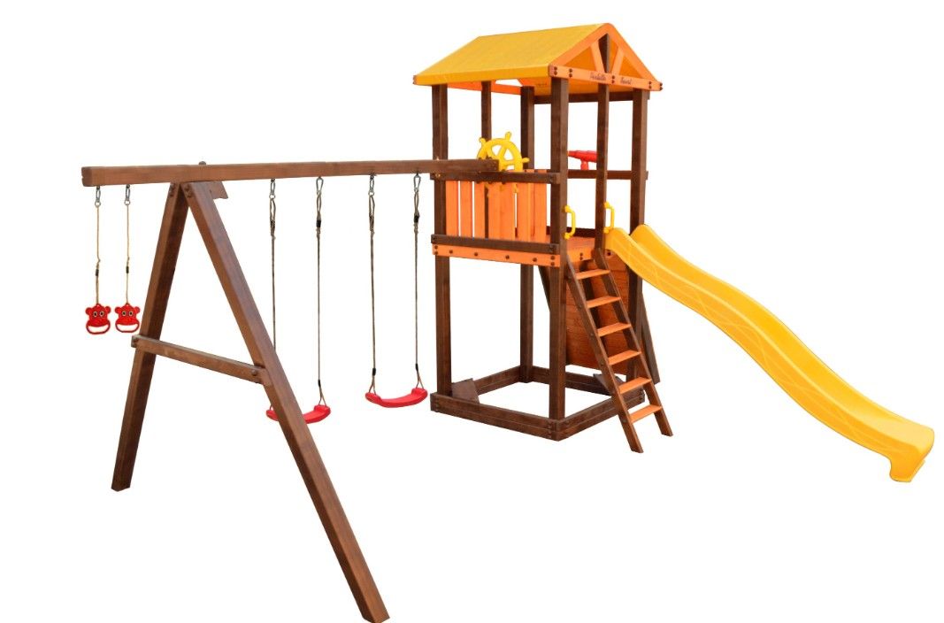 Комплектация: игровой домик, песочница, лестница, скат, ручка пластиковая - 2 шт, А-опция, качели "Лодочка" 2 шт, кольца "Микки", штурвал "Шторм", бинокль "Капитан", скалодром большой