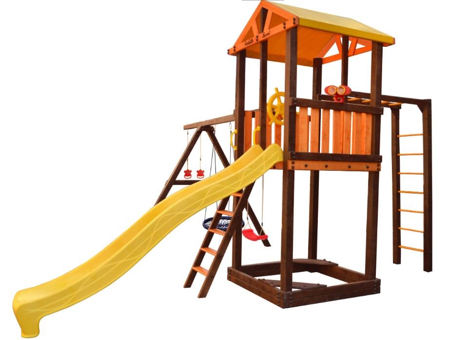 Комплектация: игровой домик, песочница, лестница, скат, ручка пластиковая - 2 шт, Р-опция, А-опция, качели "Лодочка" 2 шт, кольца "Микки", штурвал "Шторм", бинокль "Капитан", качели "Паутина"