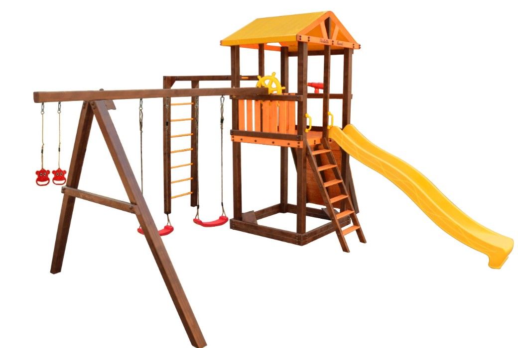 Комплектация: игровой домик, песочница, лестница, скат, ручка пластиковая - 2 шт, Р-опция, А-опция, качели "Лодочка" 2 шт, кольца "Микки", штурвал "Шторм", бинокль "Капитан", скалодром большой
