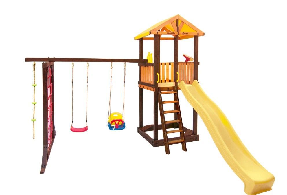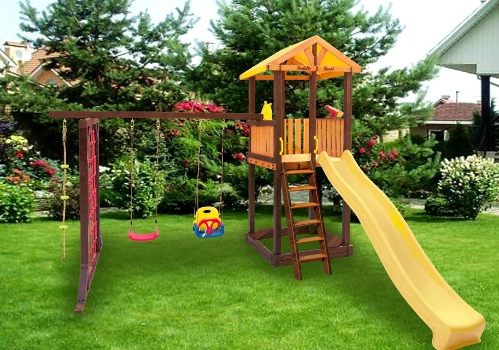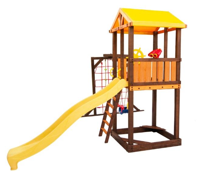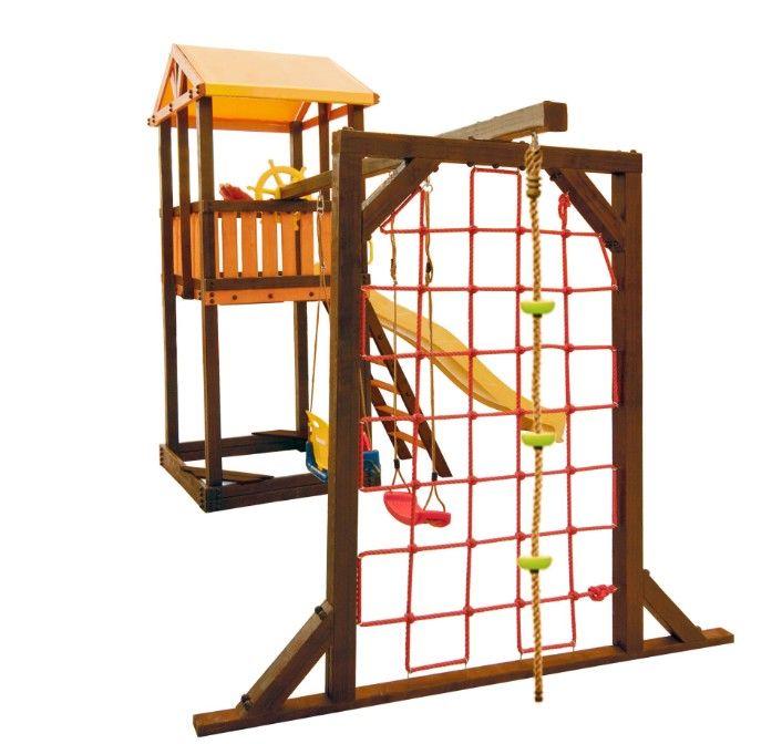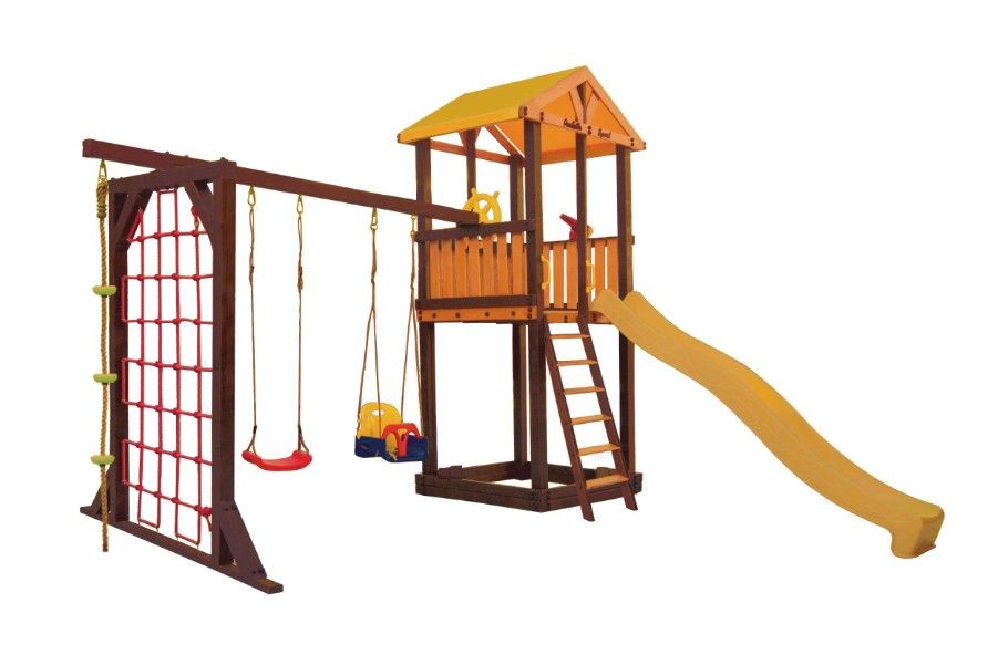 Комплектация: игровой домик, песочница, лестница, скат, ручка пластиковая - 2 шт, П-опция, качели "Лодочка" 1 шт, качели "Малыш", канат с зацепами, штурвал "Шторм", бинокль "Капитан"