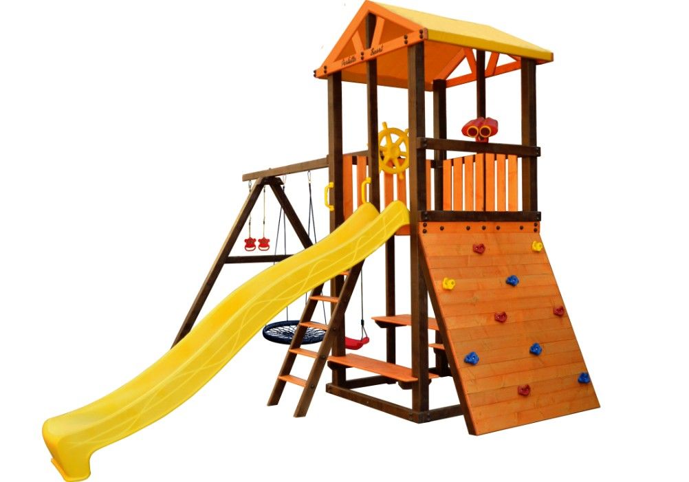 Комплектация: игровой домик, столик, лавочка - 2 шт, лестница, скат, ручка пластиковая - 2 шт, А-опция, качели "Лодочка" 2 шт, кольца "Микки", штурвал "Шторм", бинокль "Капитан", скалодром большой, качели "Паутина"