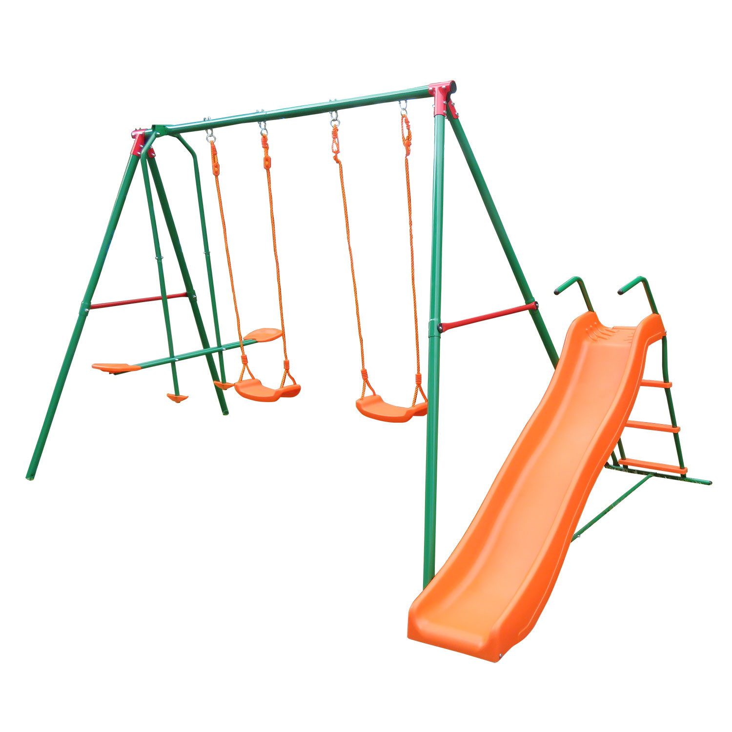 Комплекс включает в себя: веревочные качели (2 шт), двухместные качели и горку.