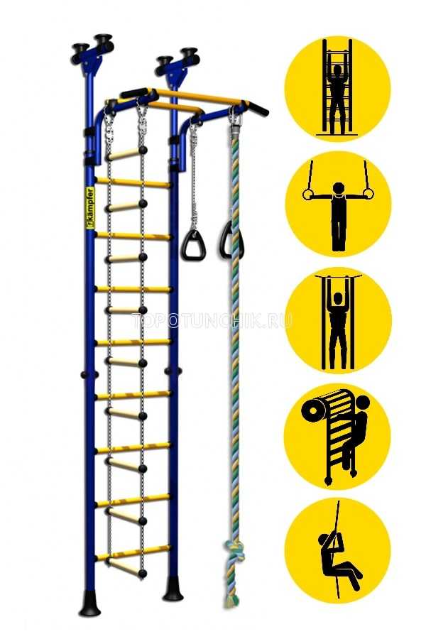- Комплектация турник подвижный переставляемый, канат, кольца гимнастические, веревочная лестница