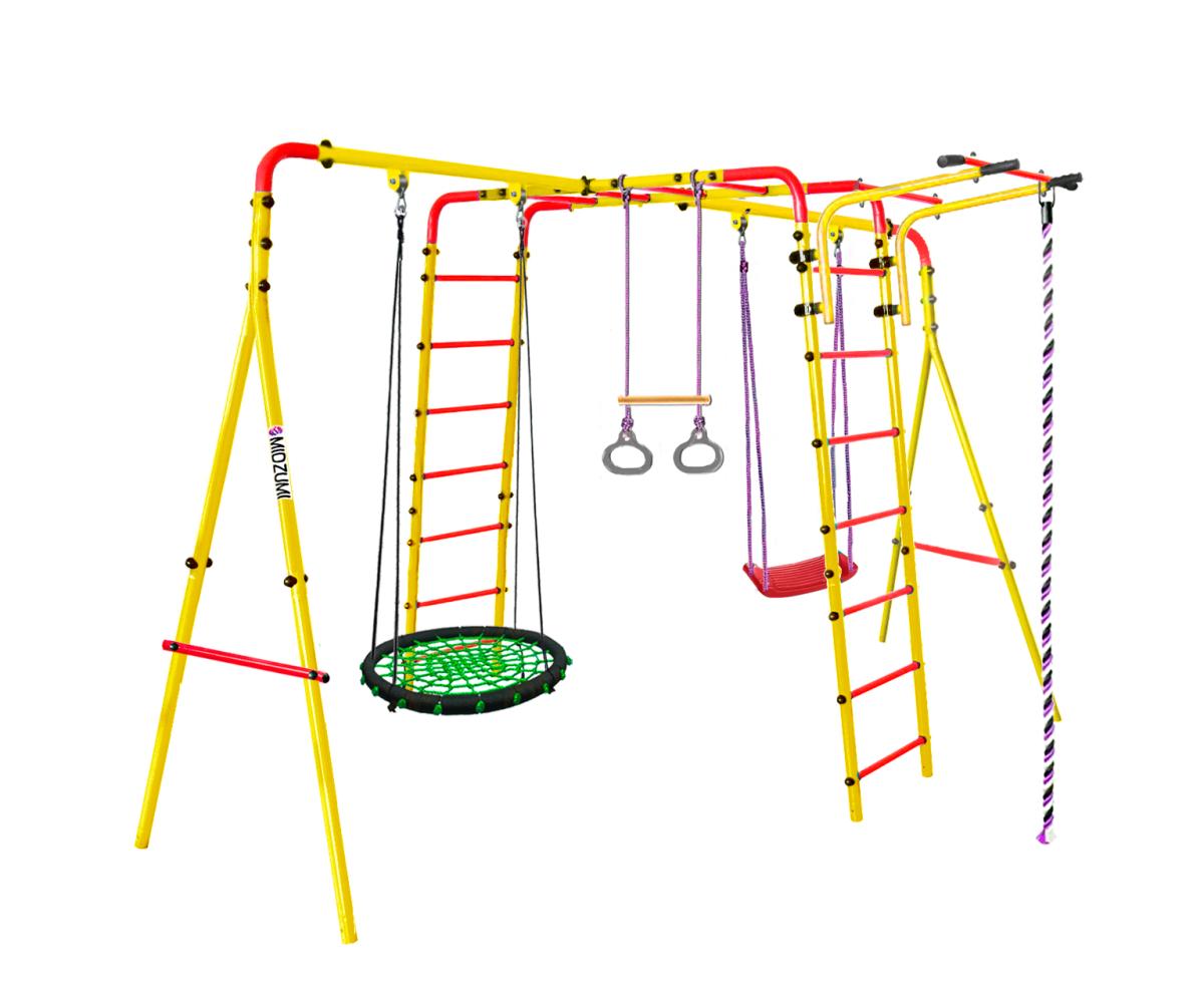 Торговый Дом Midzumi представляет новинку Уличный Детский спортивный комплекс Midzumi Chikara Large L в новом цветовом решении - солнечный день. Этот спортивный комплекс показывает разнообразие модельного ряда продукции Midzumi. Прочная металлическая конструкция позволяет выдерживать до 100 кг. Крепление Комплекса осуществляется с помощью бетонирования. Midzumi Chikara Large L состоит из каркаса двух металлических лестниц с рукоходом, передвижного турника, двух разных навесных пластиковых качелей, каната и колец с перекладиной.