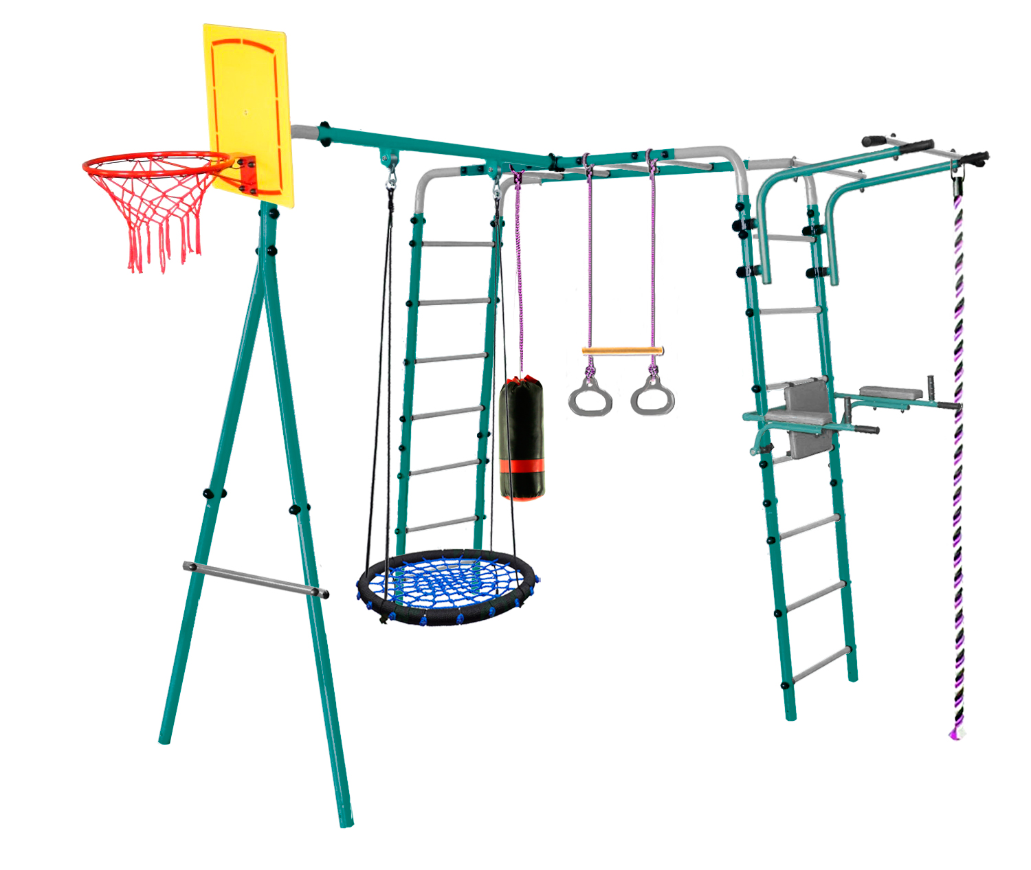 — Комплектация: каркас из металлических лестниц с рукоходом, турник, баскетбольный щит, брусья откидные со спинкой, качели-гнездо, канат, кольца с перекладиной, боксерский мешок-груша.