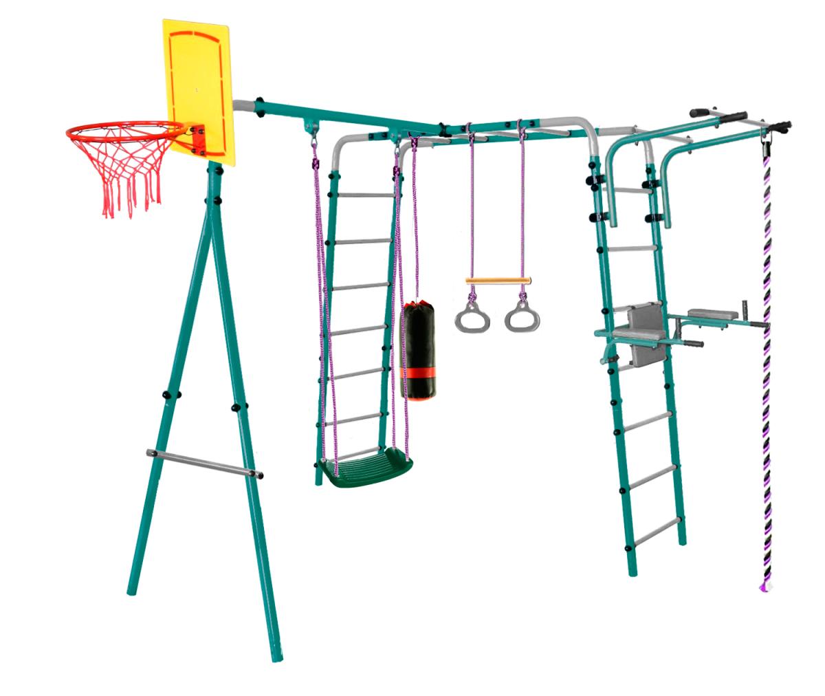 — Комплектация: каркас из металлических лестниц с рукоходом, турник, баскетбольный щит, брусья откидные со спинкой, качели, канат, кольца с перекладиной, набор боксерский мешок-груша с перчатками.