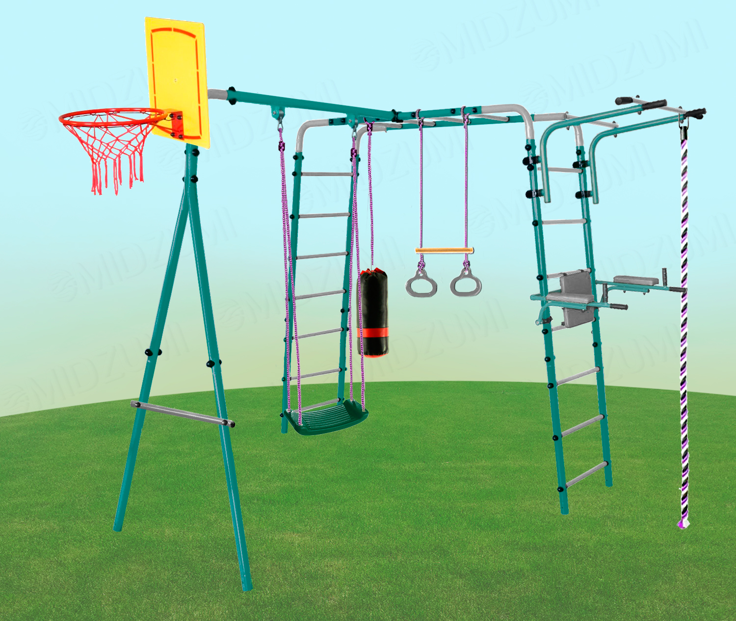 Торговый Дом Midzumi представляет новинку Уличный Детский спортивный комплекс Midzumi Hanabi Medium в новом цветовом решении - морской бриз. Этот спортивный комплекс показывает разнообразие модельного ряда продукции Midzumi. Прочная металлическая конструкция позволяет выдерживать до 100 кг. Крепление Комплекса осуществляется с помощью бетонирования. Midzumi Hanabi Medium состоит из каркаса двух металлических лестниц с рукоходом, передвижного турника, навесных пластиковых качелей, каната и колец с перекладиной, баскетбольного щита, брусьев откидных со спинкой и детской боксерской грушей с перчатками. Качественные материалы изготовления надолго сохраняют яркость цвета и рассчитаны на любые погодные условия, устойчивы к попаданию прямых солнечных лучей, морозу, дождю и перепадам температур, прослужат долго даже при самом интенсивном использовании.