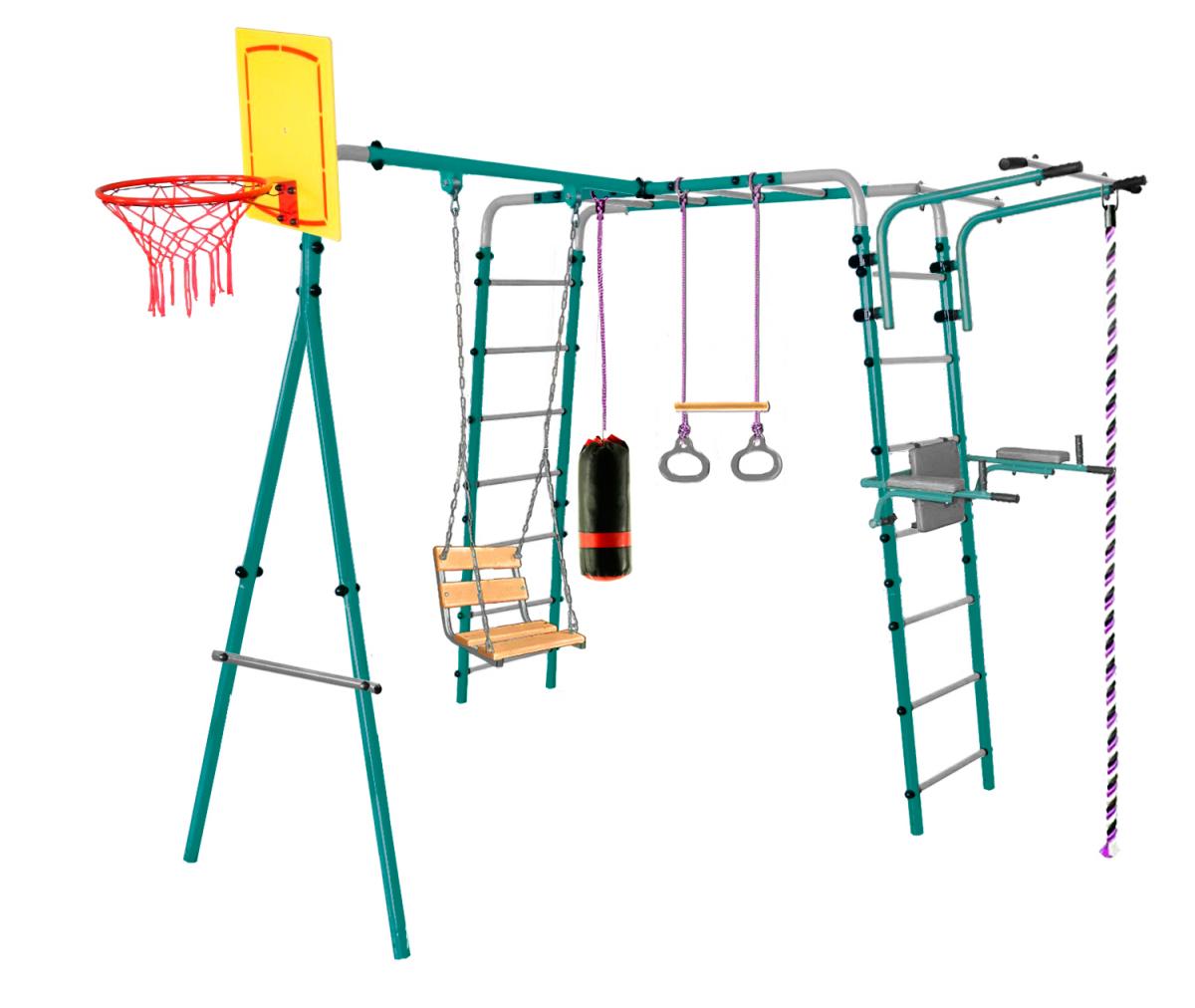 — Комплектация: каркас из металлических лестниц с рукоходом, турник, баскетбольный щит, брусья откидные со спинкой, цепные качели, канат, кольца с перекладиной, боксерский мешок-груша.