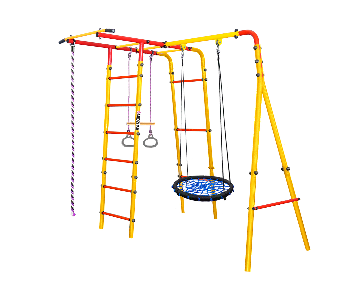 — Комплектация: каркас из металлических лестниц с рукоходом, турник, качели, канат, кольца с перекладиной.
