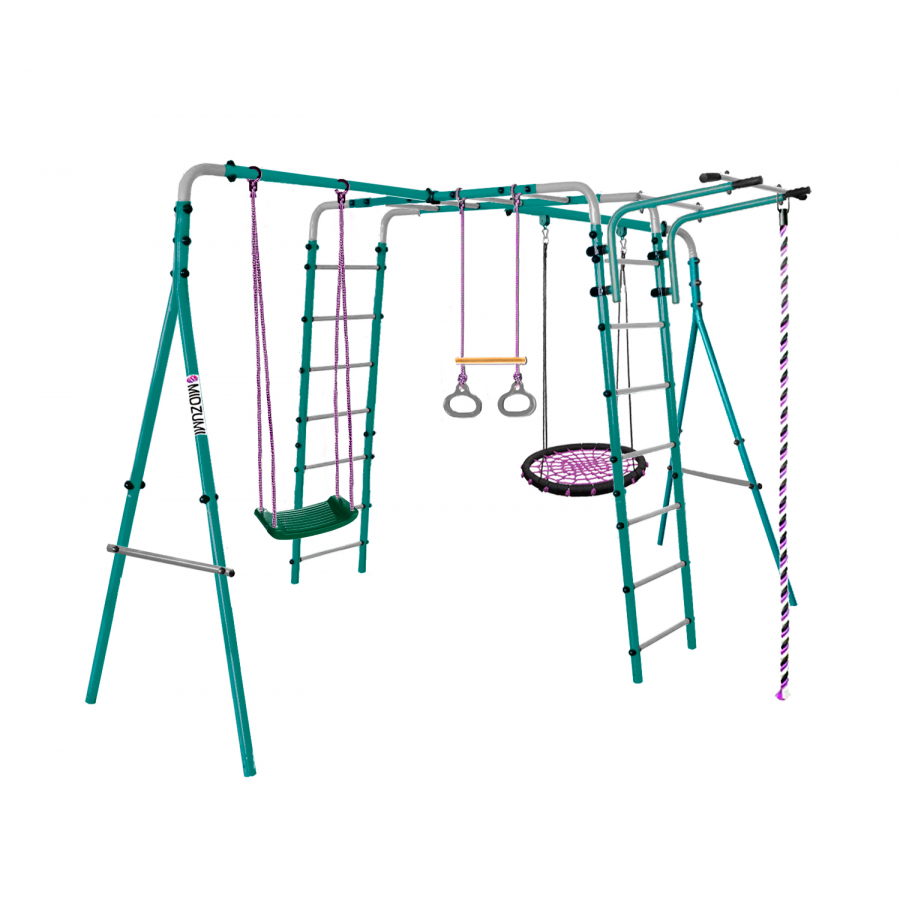 - Комплектация металлический каркас, две лестницы, качели, качели-гнездо, рукоход, турник, канат, кольца