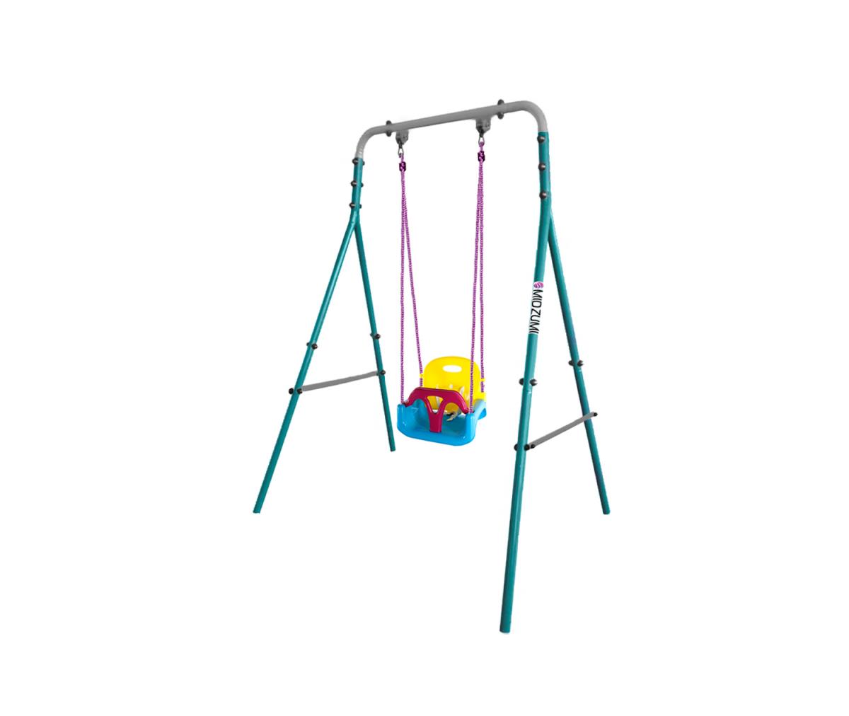 Торговый Дом Midzumi представляет новинку Уличный Детский спортивный комплекс Midzumi Satoru Small - в новом цветовом решении - морской бриз. Этот спортивный комплекс показывает разнообразие модельного ряда продукции Midzumi. Прочная металлическая конструкция позволяет выдерживать до 100 кг. Крепление стоек качелей осуществляется с помощью бетонирования. Midzumi Satoru Small состоит из металлического каркаса и подвесных пластиковых качелей 3в1. Это облегченный вариант классических качелей наиболее безопасный для детей, а также яркая раскраска и интересный дизайн качелей 3в1 обязательно понравятся малышу. Качели Midzumi выполнены в форме кресла с высокой съемной спинкой и дополнительным защитным ограничительным поручнем. Дополнительно к пластиковому поручню в качелях предусмотрен еще и регулируемый ремешок для полной безопасности ребенка. В дальнейшем, когда ребенок подрастет можно убрать ограничительные поручень и спинку, за счет чего размер сидения увеличится и сможет уместить как дошкольника, так и подростка. Широкое пластиковое сидение качелей изготовленно из современного прочного материала и снабжена водостойким полиамидным шнуром, благодаря чему качели обладают повышенной износостойкостью и позволяют выдерживать максимальную нагрузку до 100 кг. Использование таких качелей подарит отличное настроение и восторг пользователям любого возраста! Качественные материалы изготовления надолго сохраняют яркость цвета и рассчитаны на любые погодные условия, устойчивы к попаданию прямых солнечных лучей, морозу, дождю и перепадам температур, прослужат долго даже при самом интенсивном использовании.
