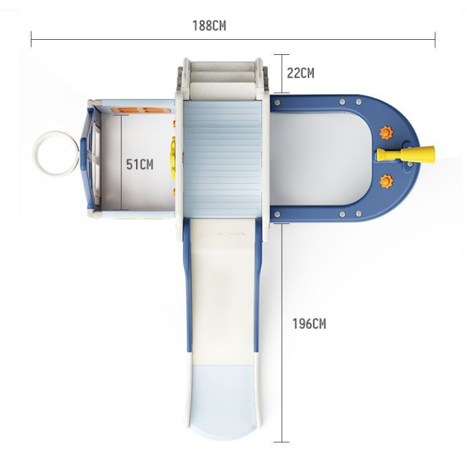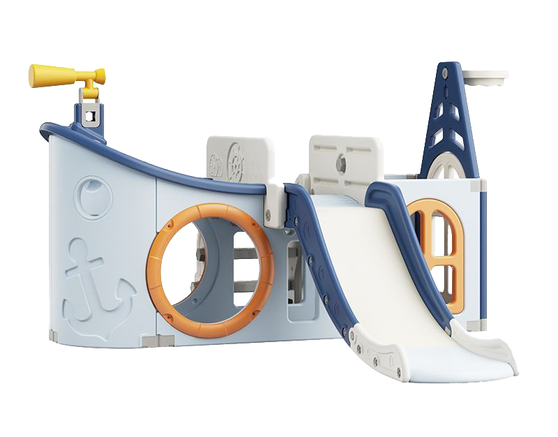 Детский игровой комплекс включает в себя игровое трюмо, горку, дверь, подзорную трубу и баскетбольное кольцо.