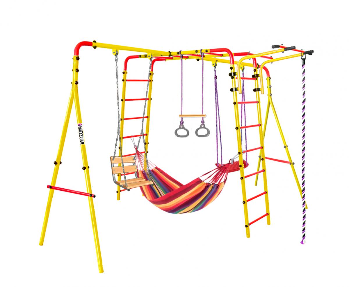ОписаниеТорговый Дом Midzumi представляет новинку Уличный Детский спортивный комплекс Midzumi Chikara Akarui Universal в новом цветовом решении - солнечный день. Этот спортивный комплекс показывает разнообразие модельного ряда продукции Midzumi. Прочная металлическая конструкция позволяет выдерживать до 100 кг. Крепление Комплекса осуществляется с помощью бетонирования. Midzumi Chikara Akarui Universal состоит из каркаса двух металлических лестниц с рукоходом, передвижного турника, двух разных навесных качелей, подвесного гамака, каната и колец с перекладиной.
