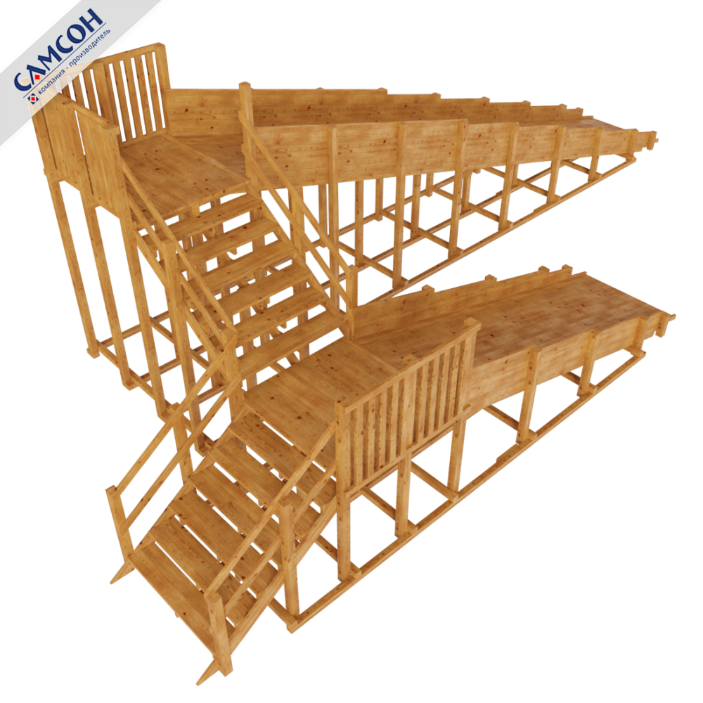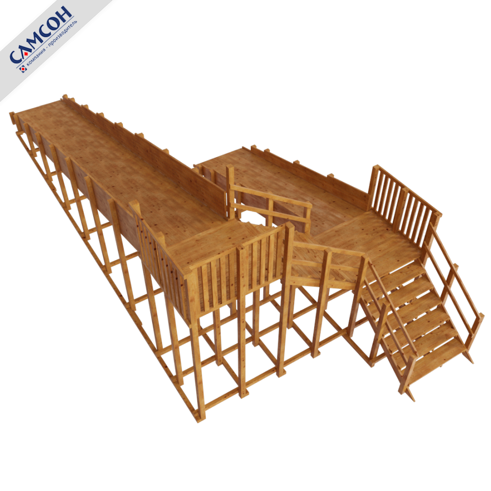 Каркас изделия изготовлен из клеенного бруса лиственницы, ограждение и иные элементы из массива сосны.