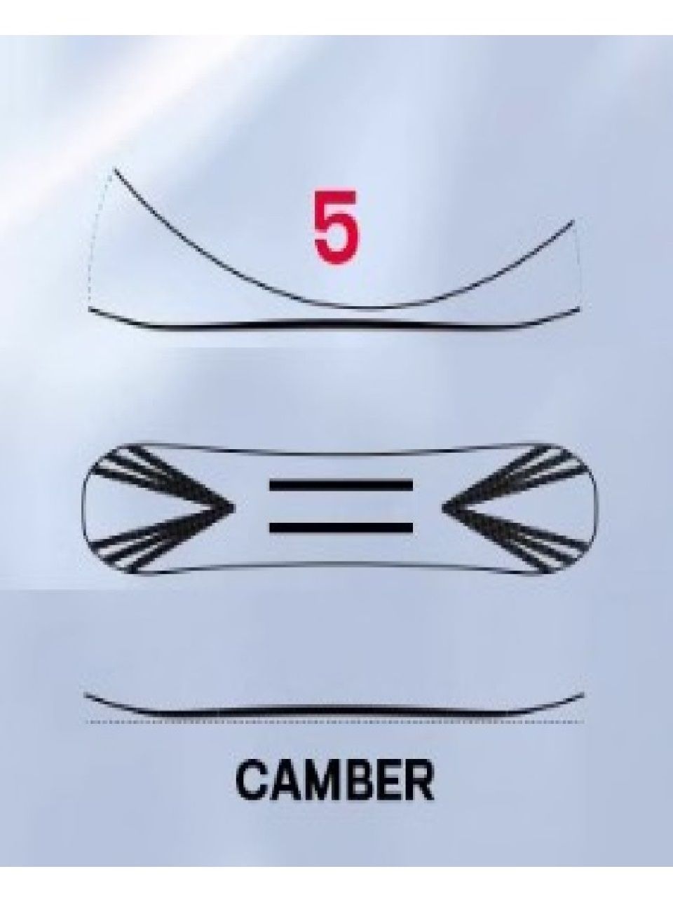 V-образные углеродные волокна на обоих концах улучшают точки контакта со снегом, в то время как параллельные углеродные волокна в центре усиливают сердечник доски.