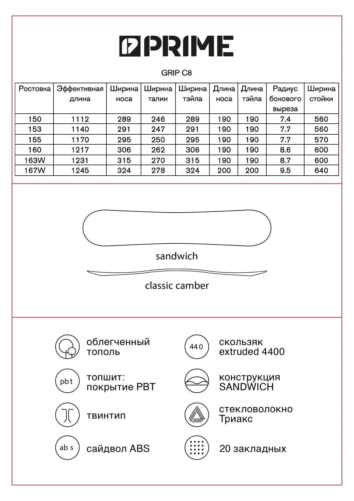 Четкость в деталях и строгость в общем исполнении — доска PRIME GRIP для того, кто серьезно наcтроен на покорение вершин. Classic кэмбер в сочетании с жесткостью чуть выше средней придаст больше контроля на больших скоростях в горах и оставит место хорошему щелчку на кикерах.