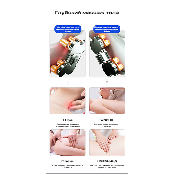 Максимально глубокая проработка мышц, имитирующая движения профессионального массажиста.