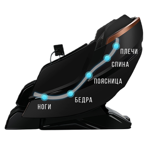 Подогревающее воздействие на зоны спины, бедер, голеней и кистей обеспечивает глубокий прогрев мышц. Инфракрасный подогрев в зонах спины, бедер, голеней и кистей усиливает эффект массажа, снимая спазмы и повышая комфорт.