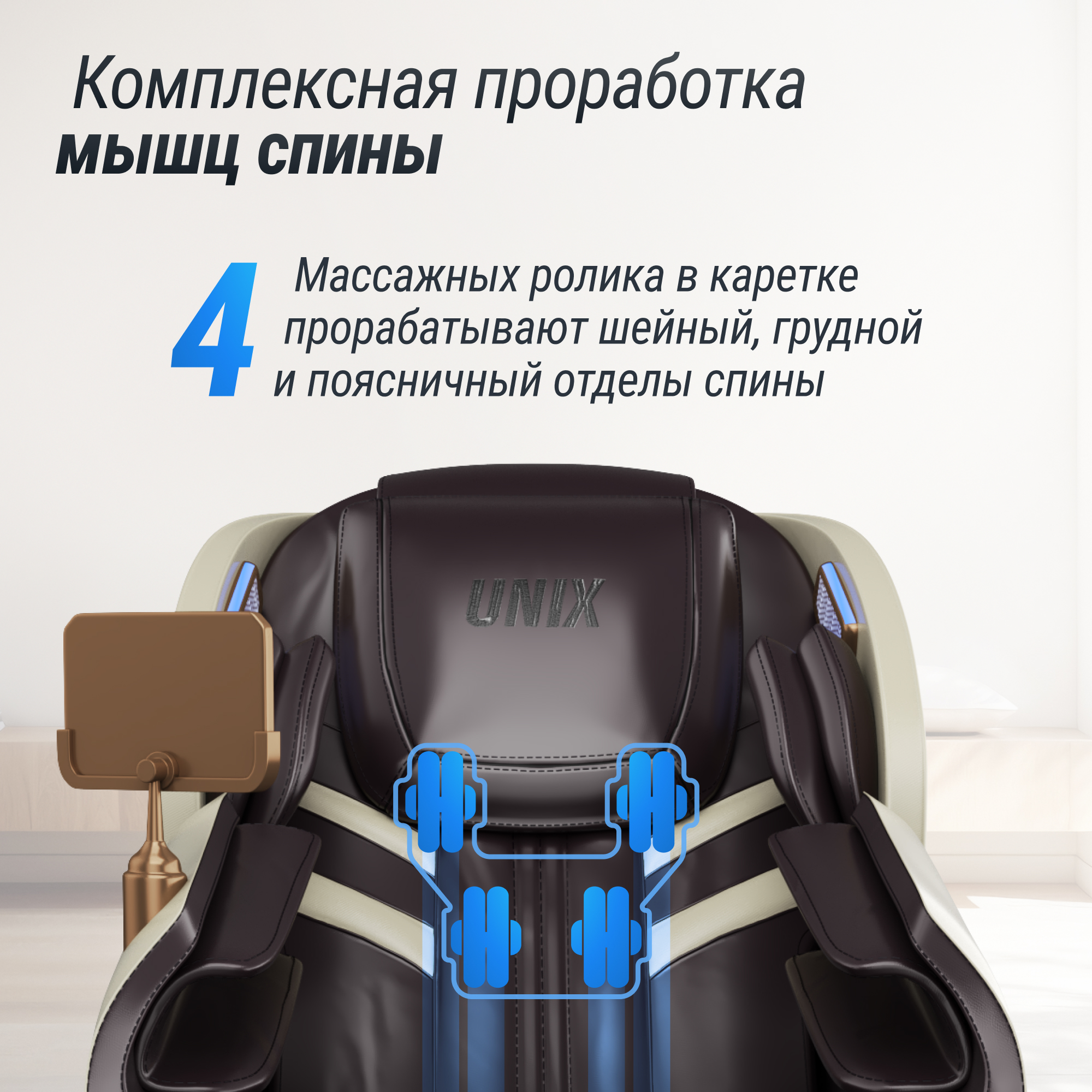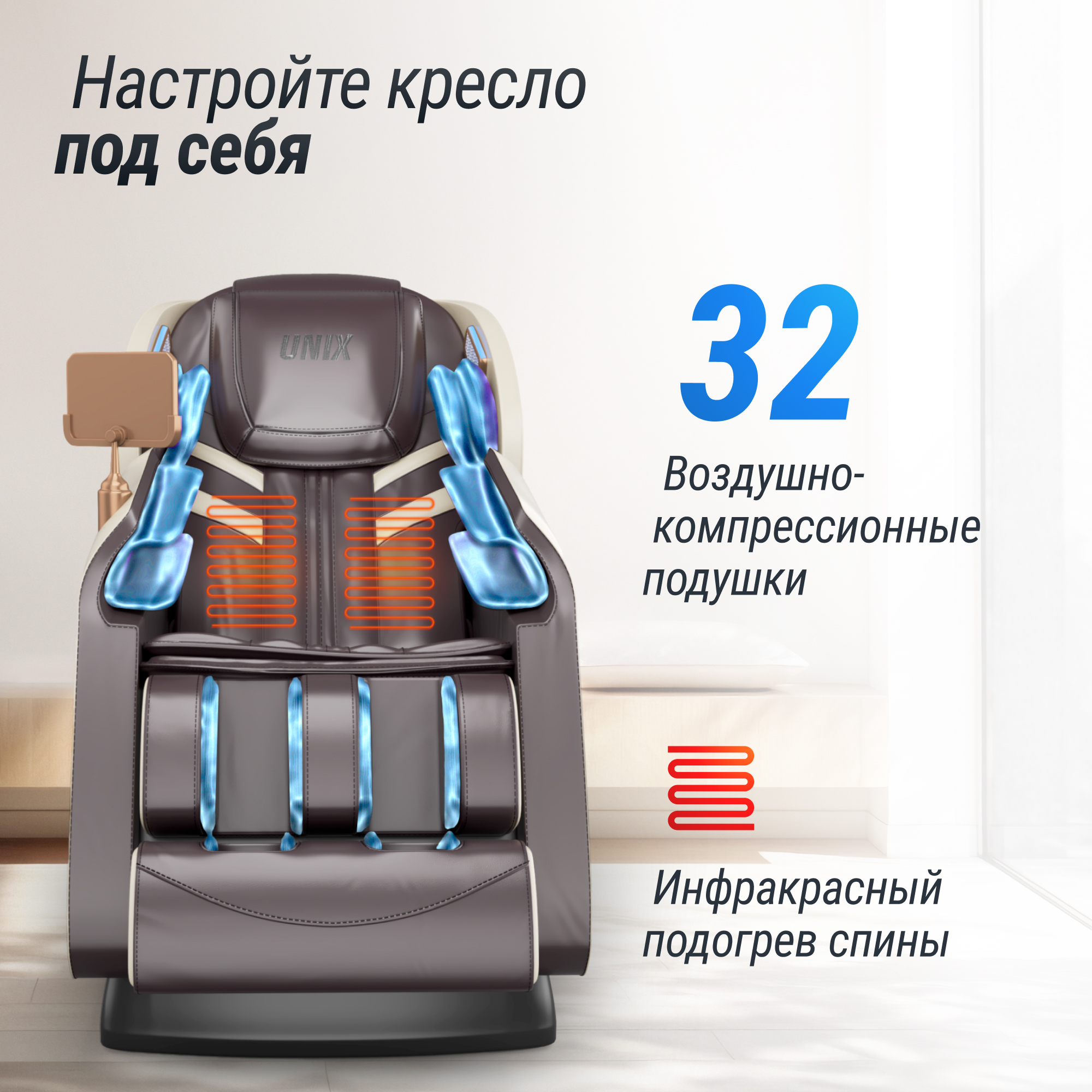- Встроенные динамики позволят во время массажа слушать любимую музыку через Bluetooth со звуком Hi-Fi. Кресло позволяет синхронизировать вашу любимую музыку с массажным механизмом. Расслабьтесь под свою любимую музыку и получайте удовольствие с массажным креслом UNIX Med. Встроенная функция Bluetooth позволяет подключать ваше устройство и наслаждаться любимыми мелодиями или расслабляющими звуками природы во время массажа спины, ШВЗ (шейно-воротниковой зоны) или массажа ног. Создайте дома идеальную атмосферу для отдыха и восстановления сил!