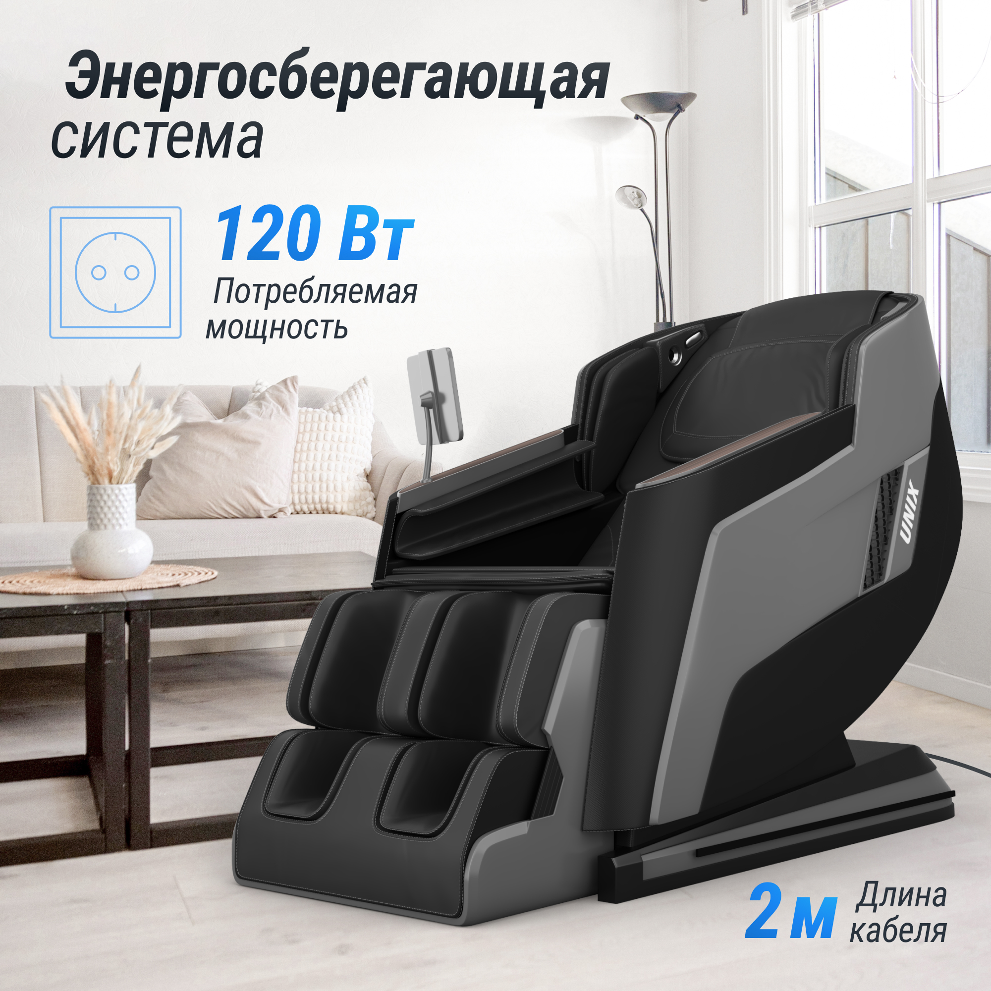 - Функции прогрева. Ролики имеют функцию ИК-прогрева, что делает массаж еще более эффективным. Встроенная система термотерапии расслабляет и успокаивает напряженные мышцы быстрее, подарит комфорт на протяжении всего сеанса. Массажное кресло UNIX Med сочетает в себе функцию подогрева стопы, подлокотников и опоры для ног. Кресло потребляет 260 Вт.