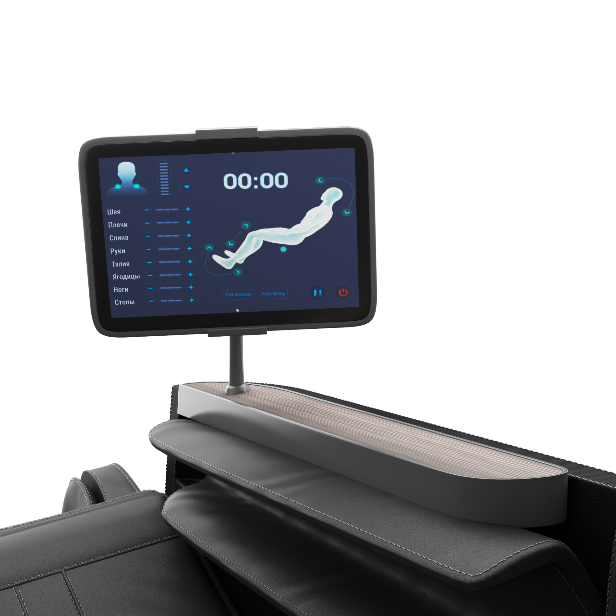 - Управляйте с легкостью! Интуитивно понятный большой пульт управления в виде планшета располагается на подлокотнике. Массажное кресло оснащено поворотным переключателем для управления программами массажа, регулировкой интенсивности массажа, регулировкой положения высоты упора для ног, положения упора для ног вперед или назад, высоты спинки кресла, положения роликового массажера для спины. Функция памяти для двух пользователей положения массажера для плеч, интенсивности массажа, положение массажера для икроножных мышц и прочие данные о режиме массажа. При необходимости в меню можно настроить подогрев, роликовые массажеры, яркость экрана, время, язык и отображение состояния. Каждый человек уникален и кресло это понимает! С помощью интуитивно понятного пульта управления вы сможете легко настраивать интенсивность массажа, выбирать зоны воздействия и даже сохранять любимые настройки для 2-х пользователей.