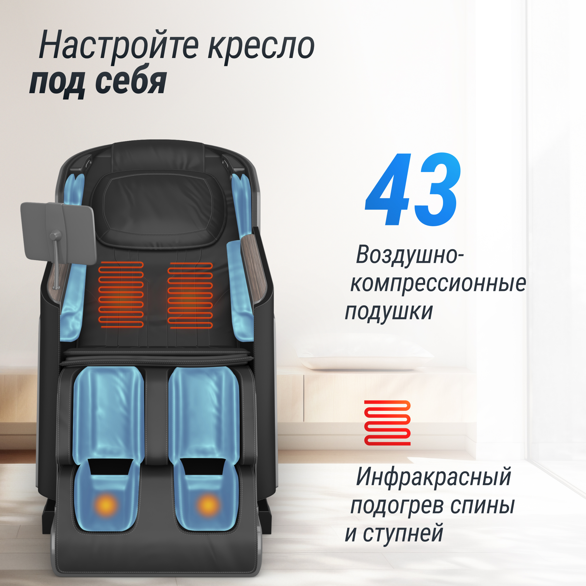 - 3D массаж. Массажное кресло оснащено передовыми технологиями, которые обеспечивают глубокий и качественный массаж, сравнимый с работой профессионального массажиста. Уникальная система 3D-массажа адаптируется под анатомические особенности тела, прорабатывая каждую мышцу и снимая напряжение. Вы сможете выбирать из множества программ или сделать акцент на конкретной зоне - восстановиться после интенсивной тренировки или расслабиться перед сном, что делает кресло идеальным выбором для любого образа жизни. Среди наиболее востребованных массажных зон стоит отдельно отметить массаж шейно-воротниковой зоны (ШВЗ), роликовый массаж ног и икроножных мышц, а также массаж спины и плеч. Благодаря точечной проработка мышц достигается максимальное расслабление и релакс. Движение роликов соответствует изгибам тела, что позволяет охватить большую часть поверхность ног, плеч и избавиться от боли в мышцах ног и плеч.