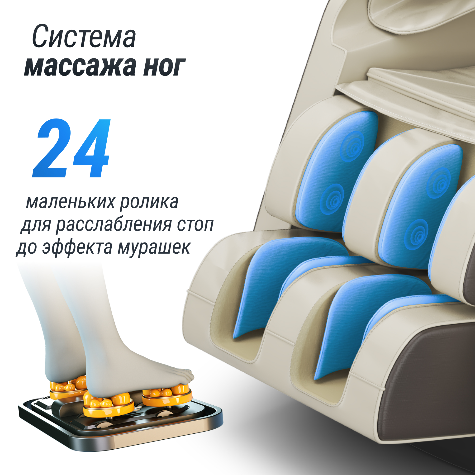 - Аэромассаж. Воздушно-компрессионный массаж со встроенными воздушными подушками расположенными по всему креслу оказывают воздействие на все тело человека. Воздушные подушки обеспечивают возможность выполнения легкого расслабляющего массажа, в результате нормализуется кровообращение и артериальное давление, убирается отечность, такой массаж благотворно влияет на лимфатическую систему, сердечно-сосудистую систему, на мышечные ткани. Чередование воздушной компрессии и обычного массажа благотворно сказывается на всех процессах в организме человека. Воздушно-компрессионный массаж рекомендован для коррекции фигуры, восстановления упругости кожи и ее эластичности.