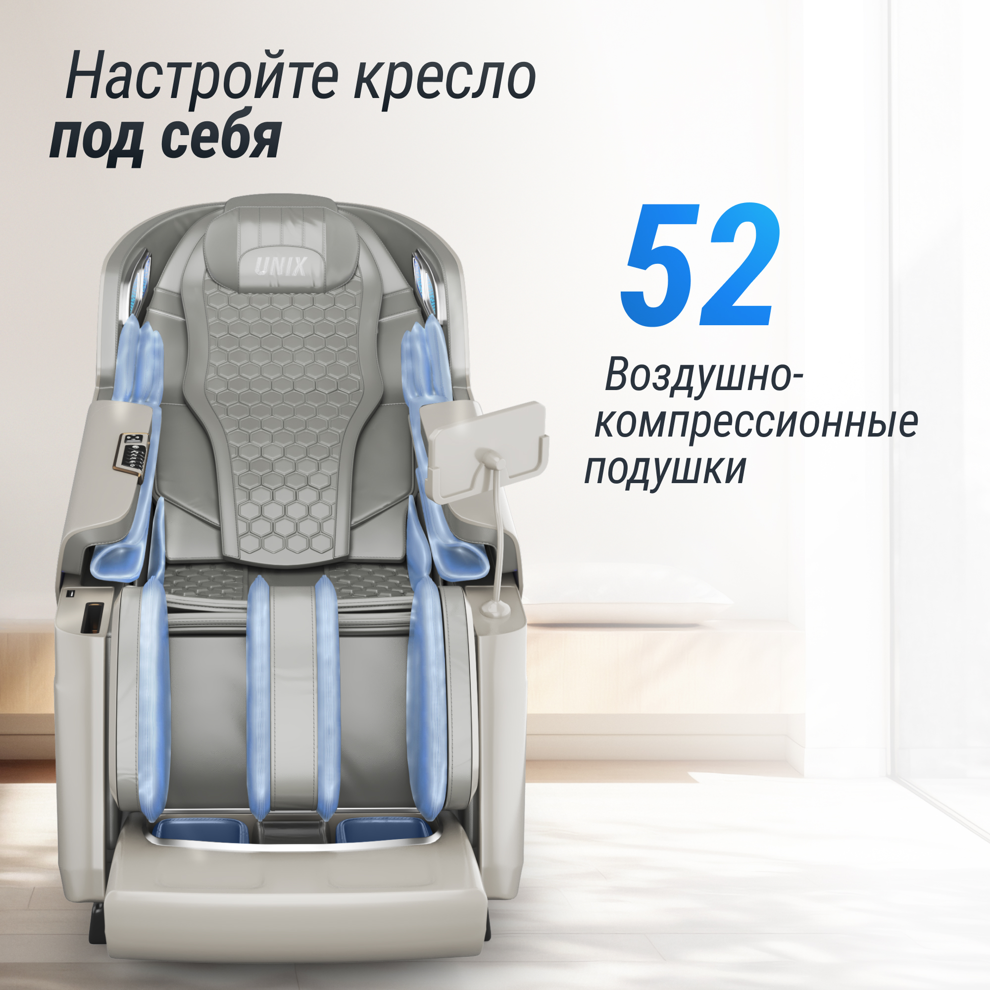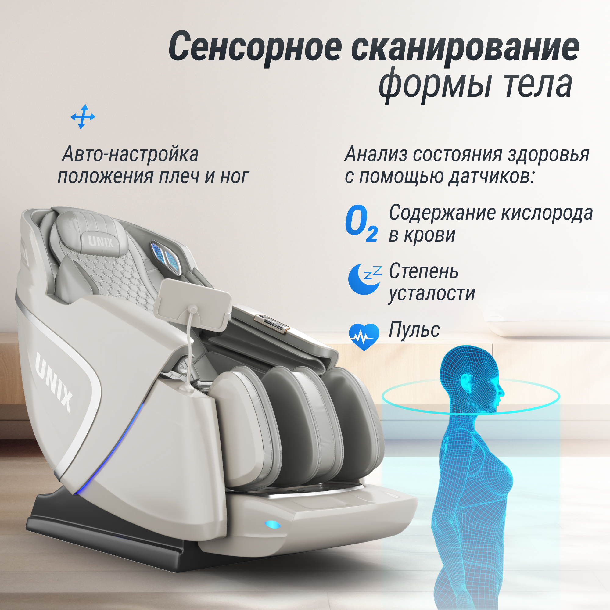 Откройте для себя новое измерение комфорта и заботы о здоровье с революционным массажным креслом UNIX Med Aura, оборудованным передовыми технологиями 4D манипулятора и датчиками анализа здоровья. Это не просто массажное кресло — это ваш личный терапевт, который всегда готов прийти на помощь. Каркас спинки в лежачем положении выполнен по технологии скользящего рельса, что позволяет разместить изделие всего в 10 см от стены, максимально экономя пространством.