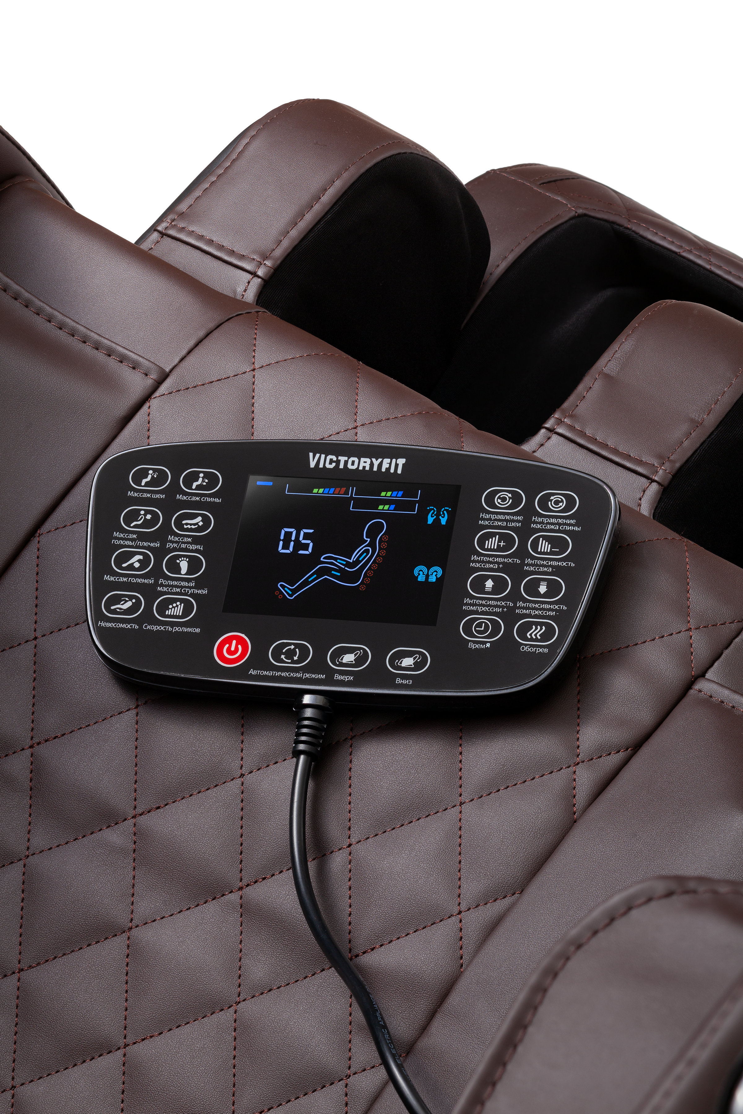 В массажном кресле VF-M76 предустановлено 20 автоматических программ. Русифицированный пульт управления. Уникальная особенность кресла — воздушно-компрессионный массаж бедер при помощи специальных накладок.