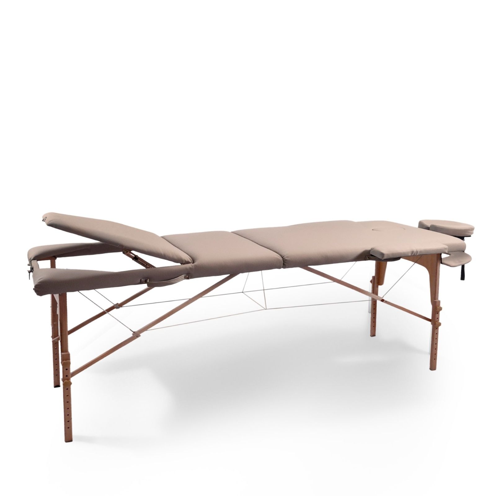 Основу каркаса и ножек составляют натуральные материалы — древесина твердых пород, покрытая безопасным лаком, что делает кушетку не только надежным, но и экологически безопасным продуктом. Усиленные ножки придают регулируемой кушетке дополнительную устойчивость, а тросы из авиационного алюминия обеспечивают надежность и долговечность. Обивка стола выполнена из высококачественной эко-кожи, устойчивой к воздействию влаги, масел и кремов, что облегчает уход за ним и продлевает срок службы.