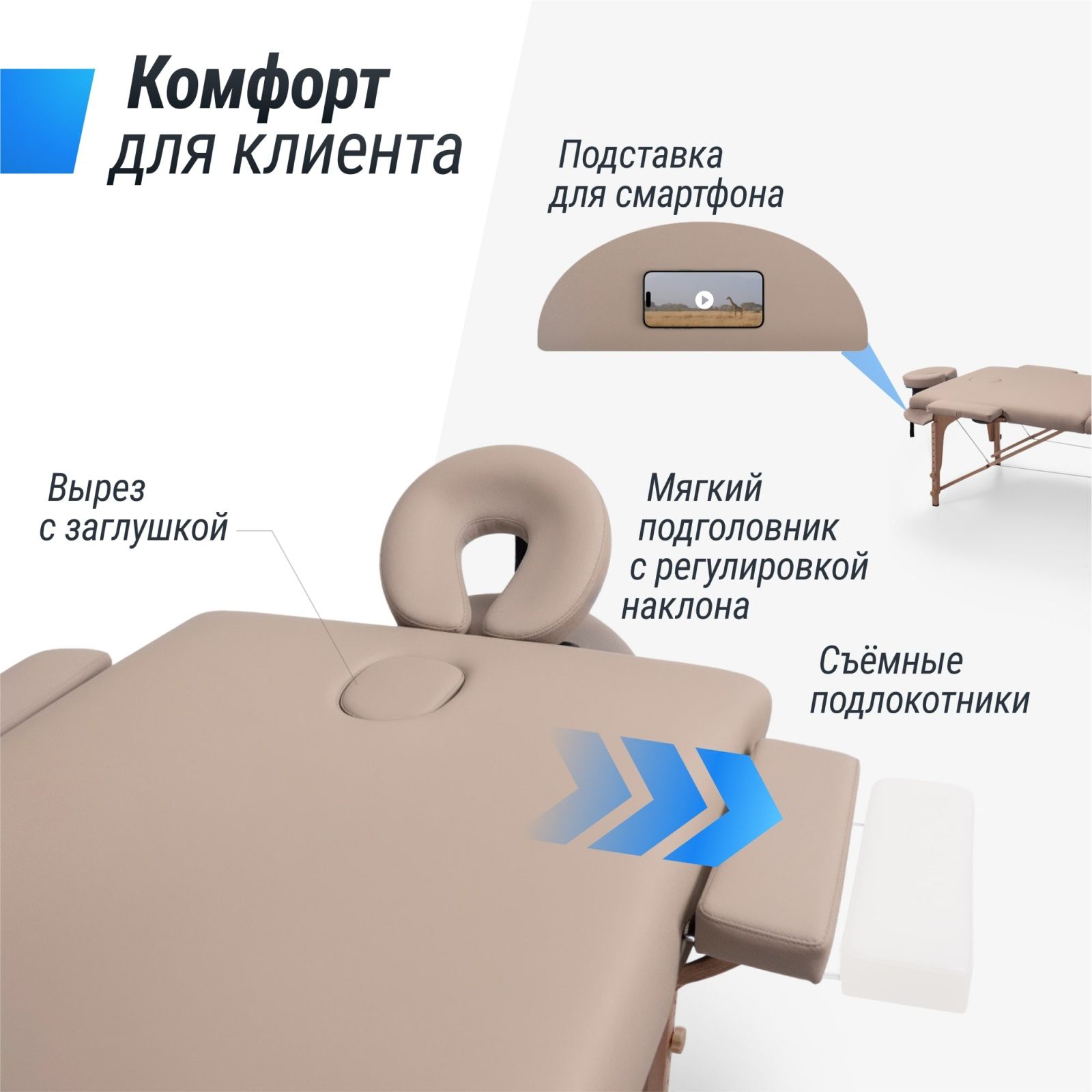 Подголовник обладает возможностью регулировки по высоте и наклону, обеспечивая идеальную поддержку головы и шеи. Ножная часть стола поднимается на 50 градусов (7 позиций), что позволяет клиентам занять самое удобное положение для проведения процедуры. Складной стол оборудован удобными подлокотниками 34х10х3,5 см, подвесной полкой для гаджетов 42 х 24 см и лямками с застежками-липучками.