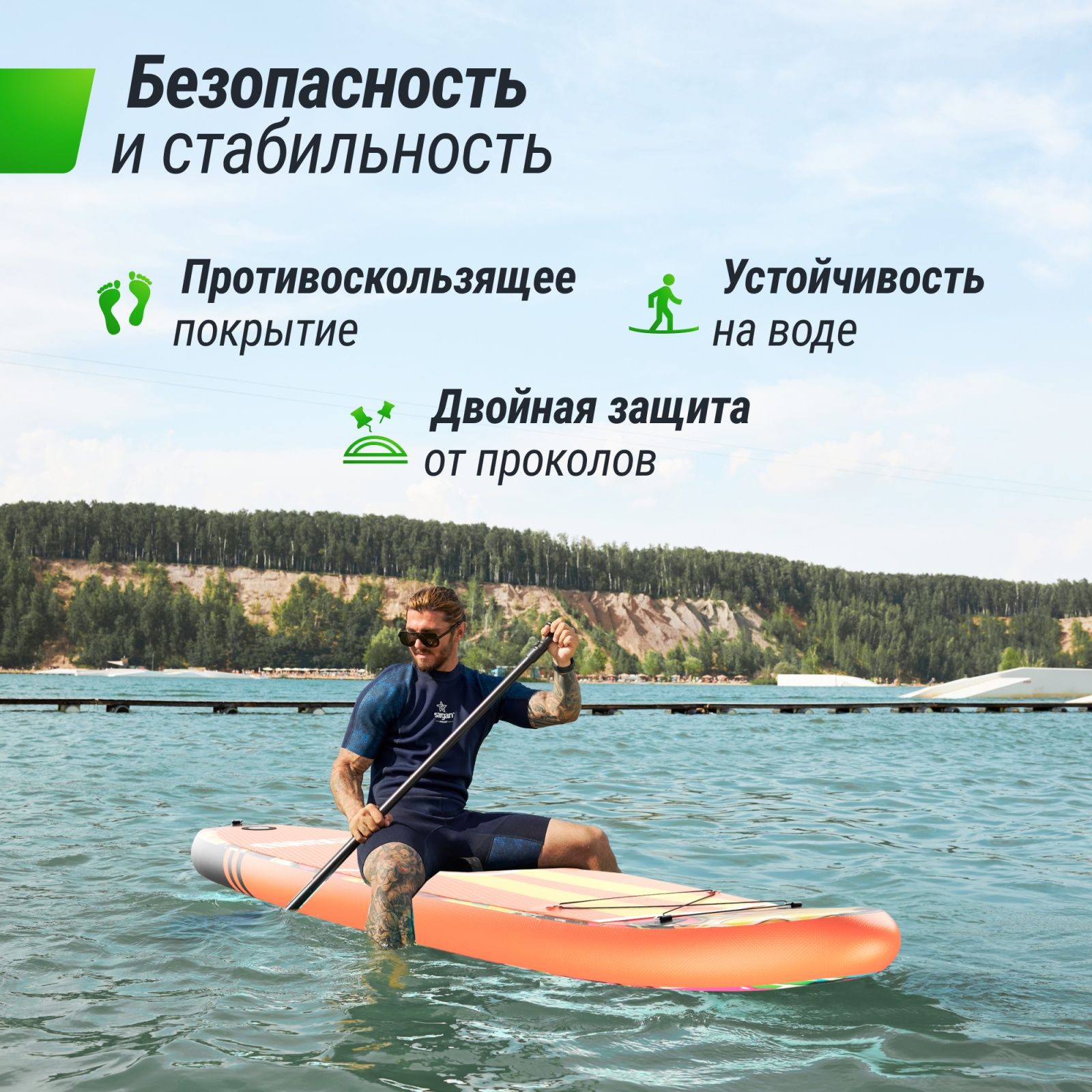 Сап-доска подходит для водных путешествий всей семьей. Подходит для передвижения с детьми и домашними животными. В целях безопасности приобретается сиденье. В комплектацию входит страховочный лиш – это гарантия безопасности и комфорта во время сапсерфинга, кайтинга или виндсерфинга. Он обеспечивает надежное соединение между ногой спортсмена и доской. Благодаря этому серфер может сосредоточиться на безмятежной прогулке, выполнении трюков или повышении своей техники на доске, ни о чем не беспокоясь.