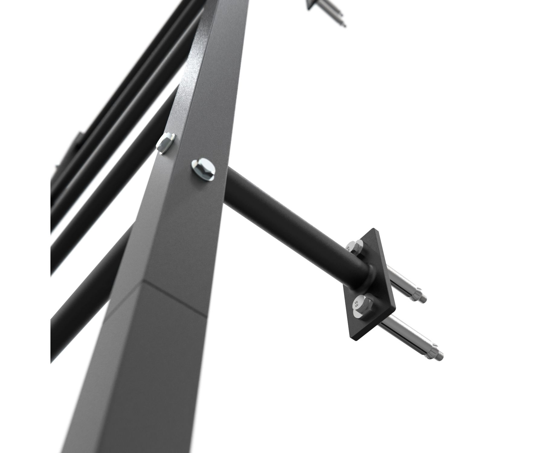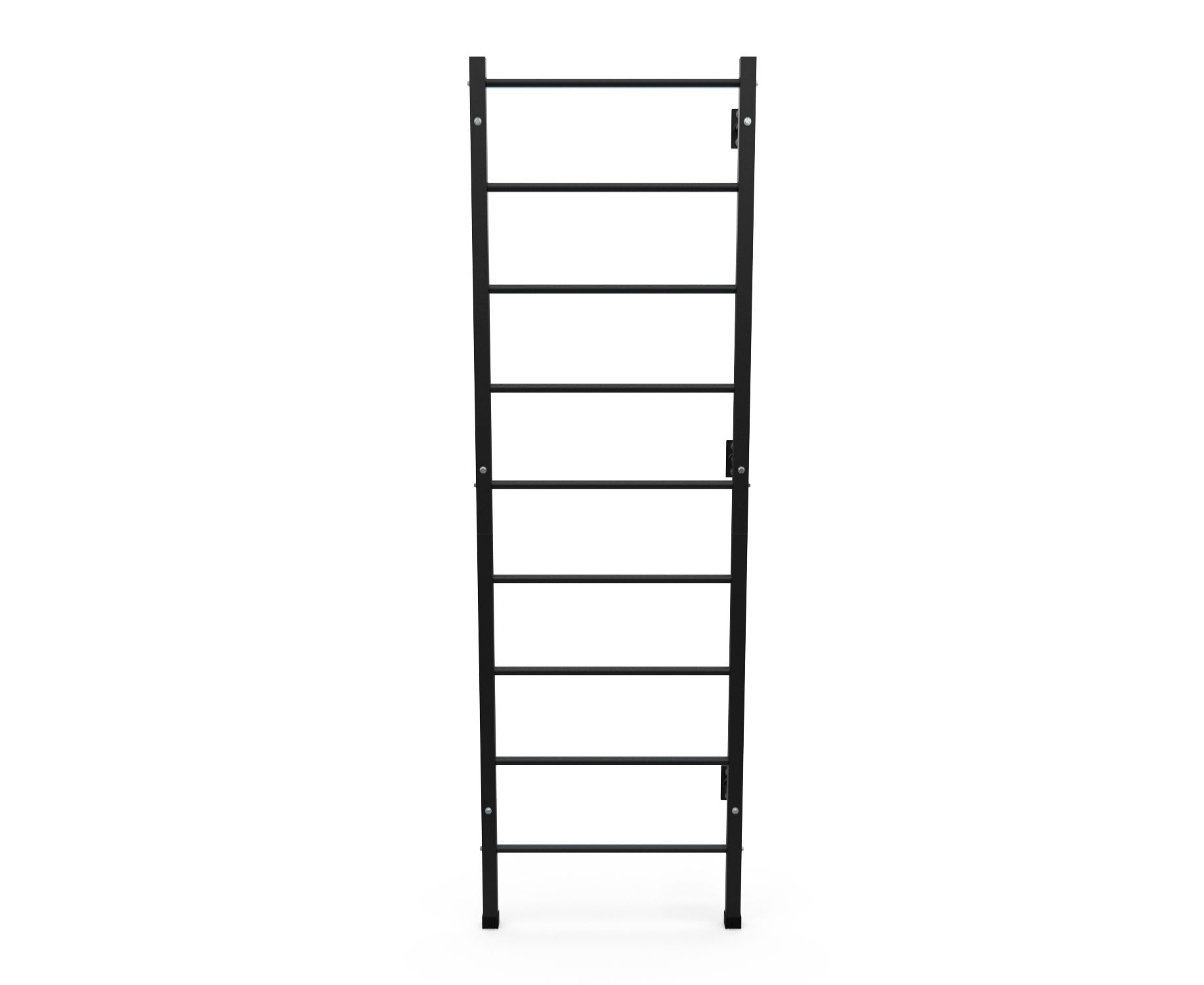 Сама стенка компактная: её высота составляет 231 см, а ширина всего 70 см. Расстояние от стены до стоек шведской стенки - 16 см. Расстояние между стойками диаметром 50 мм и толщиной 1,2 мм составляет 60,5 см, что является и шириной девяти перекладин диаметром 25 мм.