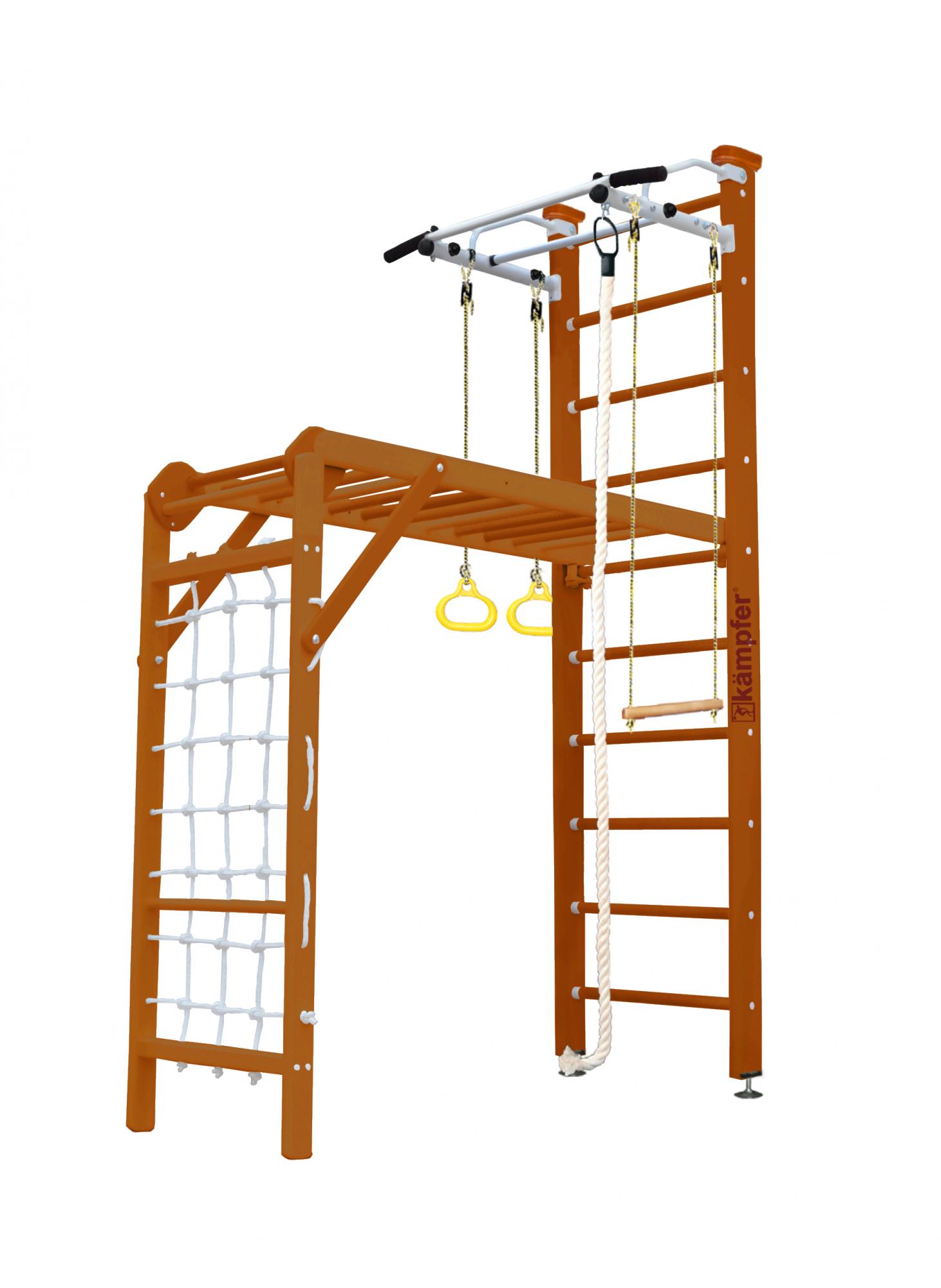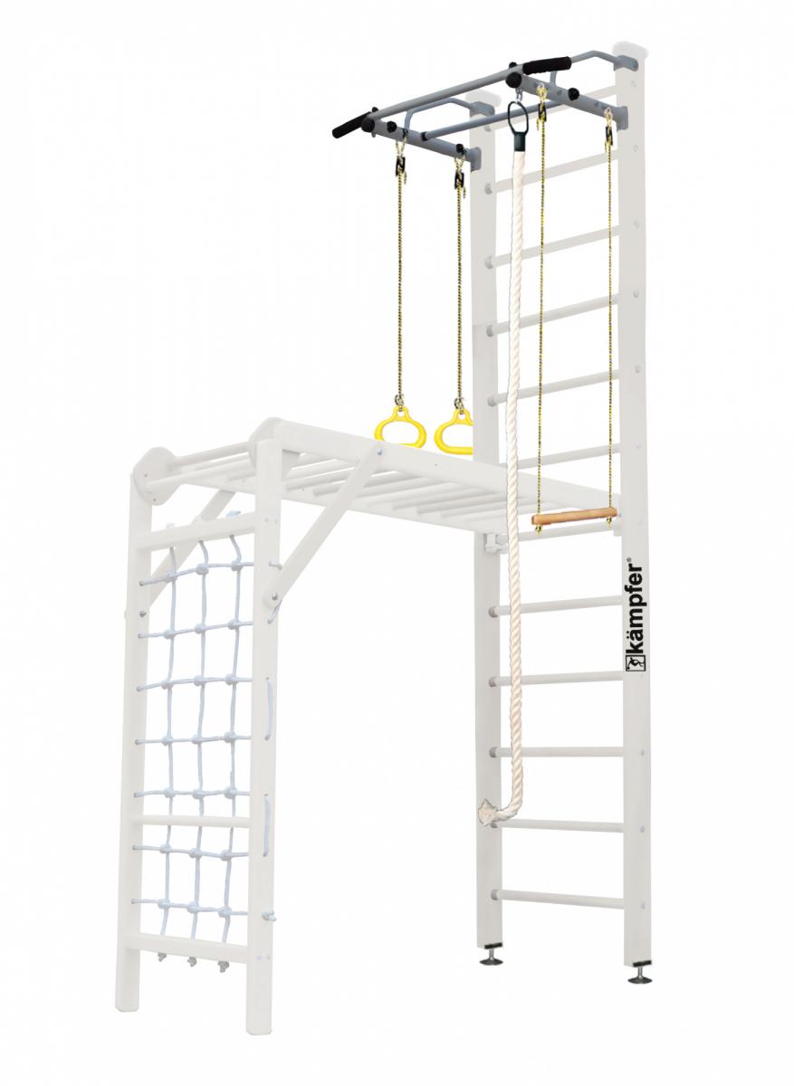 Артикул: Union CeilingДомашний спортивный комплекс Kampfer Union Ceiling это новинка на основе одной из самых популярных моделей из линейки деревянных ДСК Kampfer в цветовой гамме на выбор, что позволяет подобрать нужный оттенок под дизайн помещения. Модель Kampfer Union Ceiling включает в себя классическую шведскую стенку, металлический турник и набор из самых популярных навесных аксессуаров канат, кольца, трапецию, а также новинку уголок сетку-рукоход. Крепкий металлический турник выдерживает нагрузку до 120 кг, подходит как детям так и взрослым. Навесное оборудование Kampfer на прочных тросах выдерживает нагрузку до 100 кг. Особенностью шведской стенки Kampfer Union является уголок сетка-рукоход имеющий с одной стороный веревочную сетку, а с другой деревянную лестницу. Малышам очень нравится - лазить по веревочной сетке и лесенке. Уголок сетка-рукоход предназначен для раннего развития детей в возрасте от 7 месяцев до 4 лет, устанавливается на ступени шведской стенки и выдерживает максимальную нагрузку до 50 кг. Уголок сетку-рукоход также можно установить отдельно на пол и использовать рукоход как лестницу.