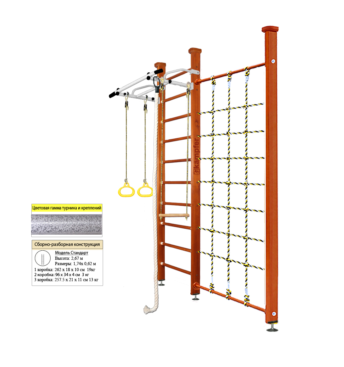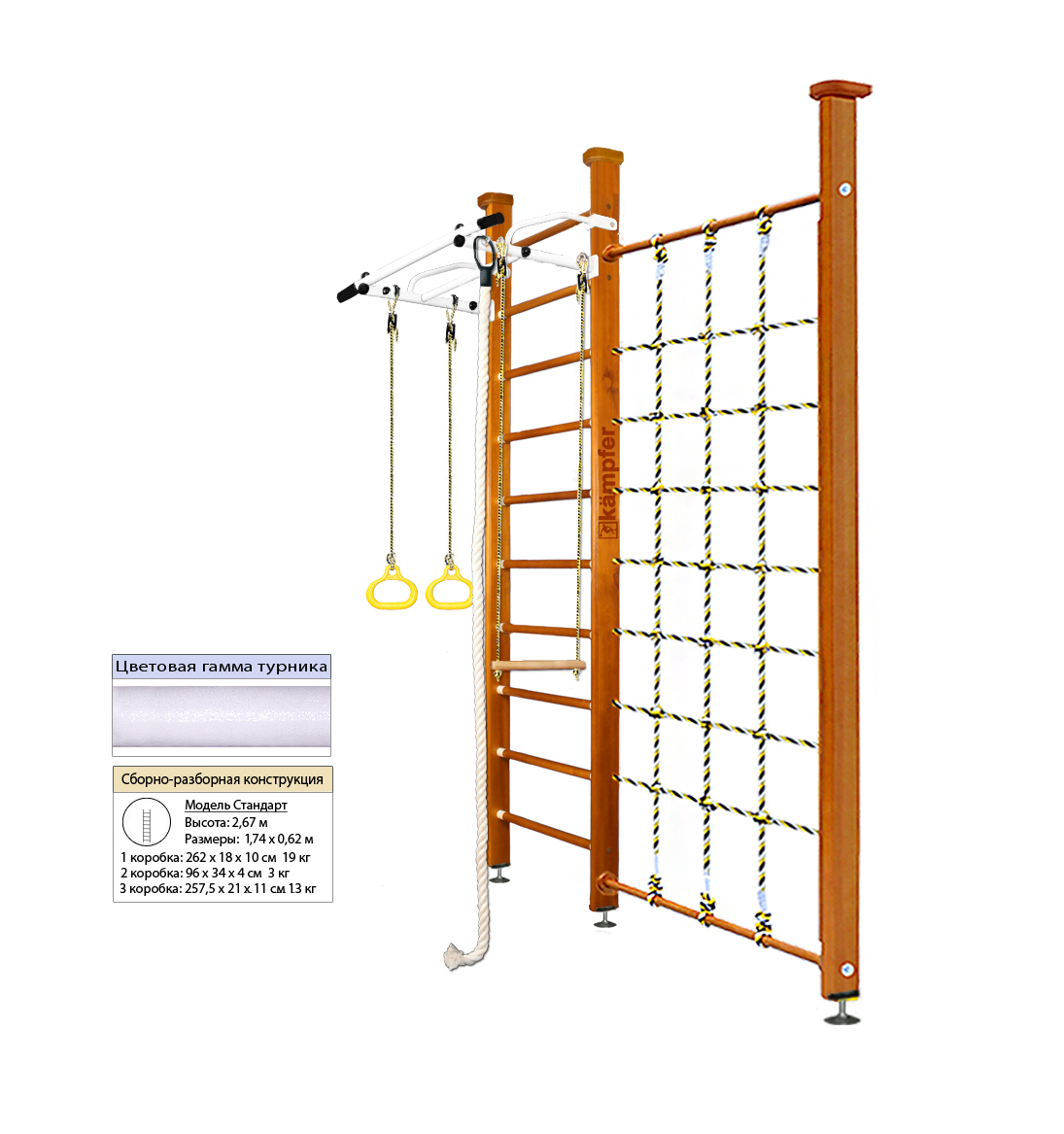 Артикул: Winner CeilingДетский спортивный комплекс Kampfer Winner Ceiling это новинка среди моделей из линейки домашних деревянных шведских стенок Kampfer. Модель Kampfer Winner включает в себя набор из самых популярных навесных аксессуаров канат, кольца и трапецию. Крепкий металлический турник выдерживает нагрузку до 120 кг, подходит как детям так и взрослым. Навесное оборудование Kampfer на прочных тросах выдерживает нагрузку до 100кг. Конструкция выполнена из натурального дерева, все края деталей немного скруглены обеспечивая большую безопасность для ребенка. В дополнении к основным аксессуарам в комплектации к Kampfer Winner идет канатный лаз - это прочная сетка шириной 90 см из крепкого шнура выдерживает нагрузку до 100кг. Стойка с сеткой Kampfer Winner значительно расширяет игровое пространство детской комнаты и позволяет разнообразить функциональность классической шведской стенки Kampfer.