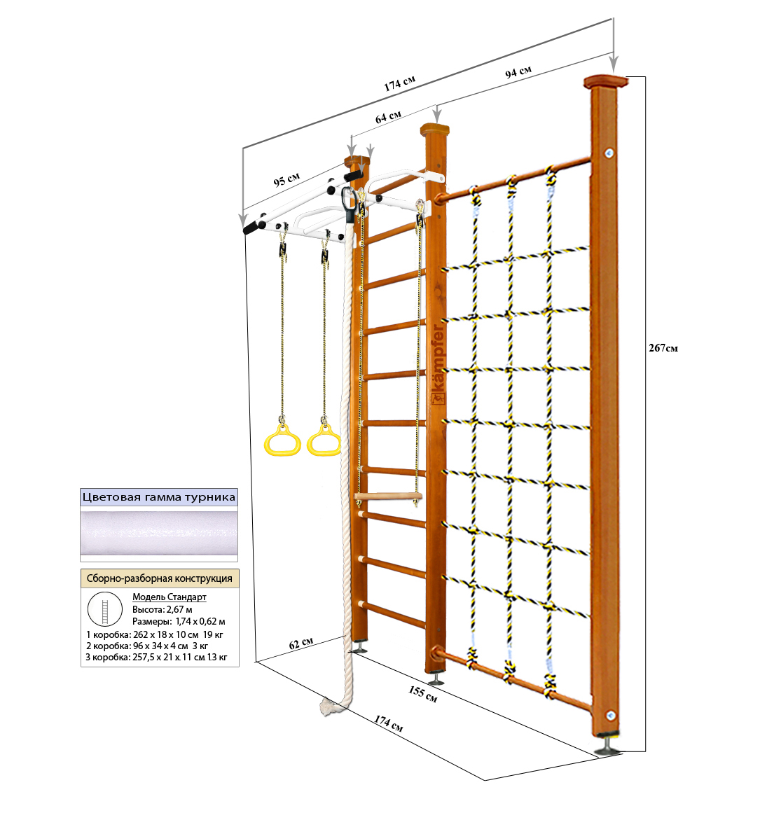 — Общая ширина шведской стенки включая стойку с сеткой и выступ рукоятки турника: 174 см