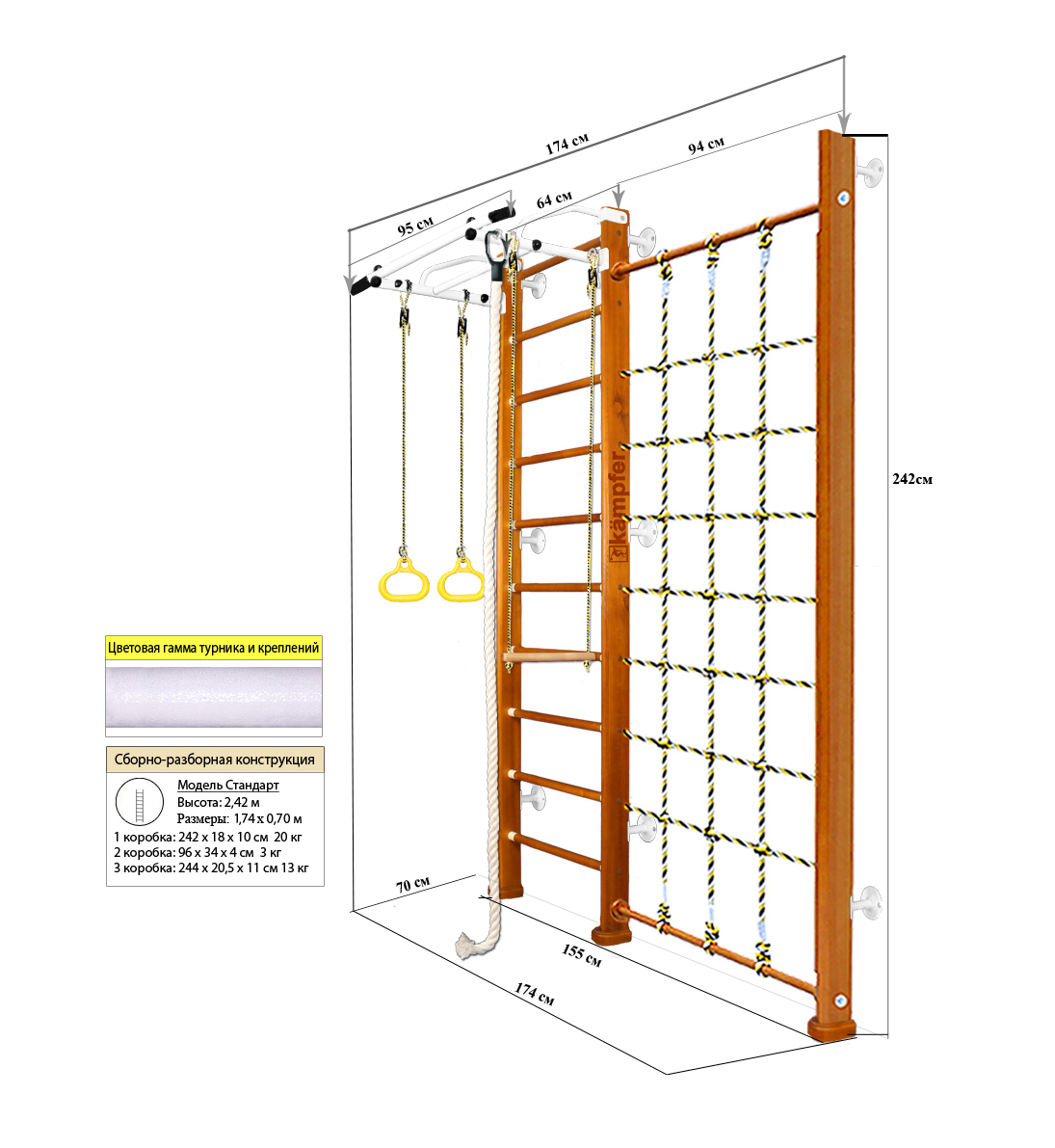 — Общая ширина шведской стенки включая стойку с сеткой и выступ рукоятки турника: 174 см