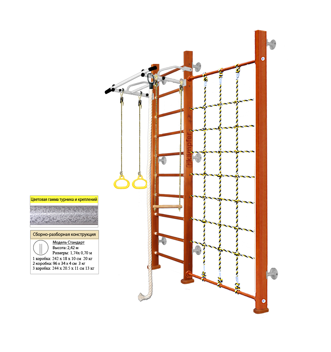Модель Kampfer Winner включает в себя набор из самых популярных навесных аксессуаров канат, кольца и трапецию. Крепкий металлический турник выдерживает нагрузку до 120 кг, подходит как детям так и взрослым. Навесное оборудование Kampfer на прочных тросах выдерживает нагрузку до 100 кг. В дополнении к основным аксессуарам в комплектации к Kampfer Winner идет канатный лаз - это прочная сетка шириной 90 см из крепкого шнура выдерживает нагрузку до 100 кг. Стойка с сеткой Kampfer Winner значительно расширяет игровое пространство детской комнаты и позволяет разнообразить функциональность классической шведской стенки Kampfer.