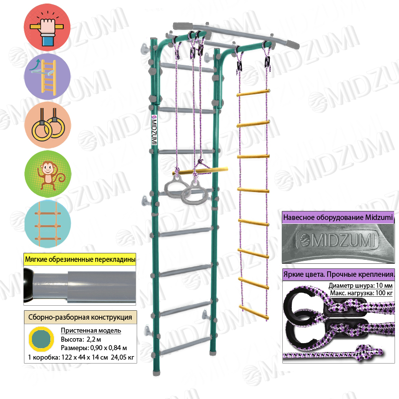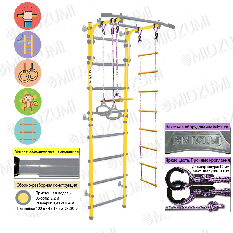 Домашний спортивный комплекс Midzumi Banji Kabe подарит ребенку возможность полюбить спорт, расти здоровыми и уверенными в себе личностями. Организуйте спортивный уголок с помощью универсальной и малогабаритной шведской стенки, которая оснащена веревочной лестницей, тарзанкой и гимнастическими кольцами.